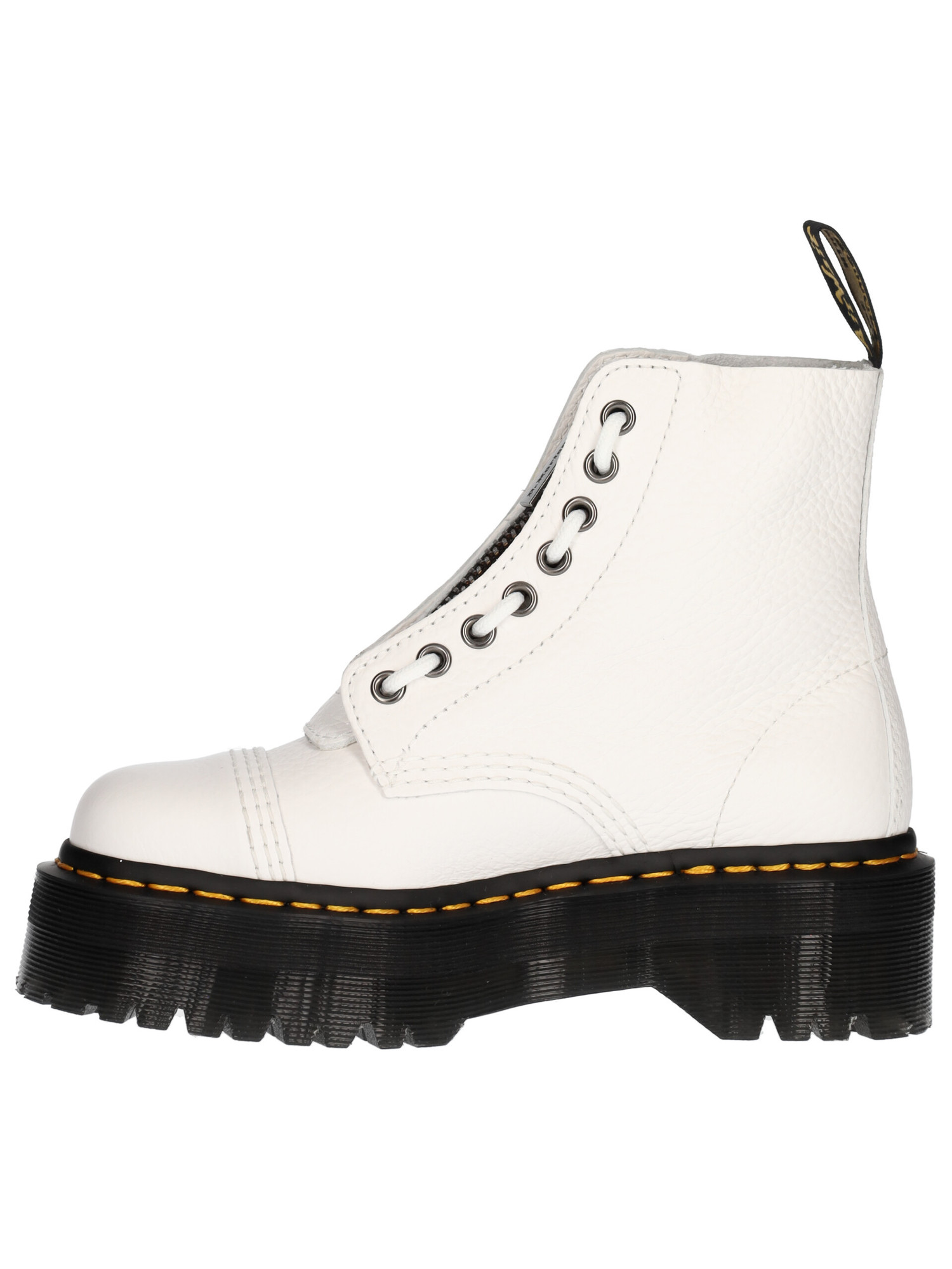 Anfibio Dr Martens Sinclair da donna con guardolo Goodyear, cuciture gialle a vista e linguetta logata sulla parte superiore del tallone, per facilitare la calzata. Otto occhielli con due tipi di allacciatura: laccio tono su tono e zip frontale (rimovibile). Cuscinetto d'aria Airwair e suola brevettata resistente ad olio, grasso e benzina con platform di 4,5cm.