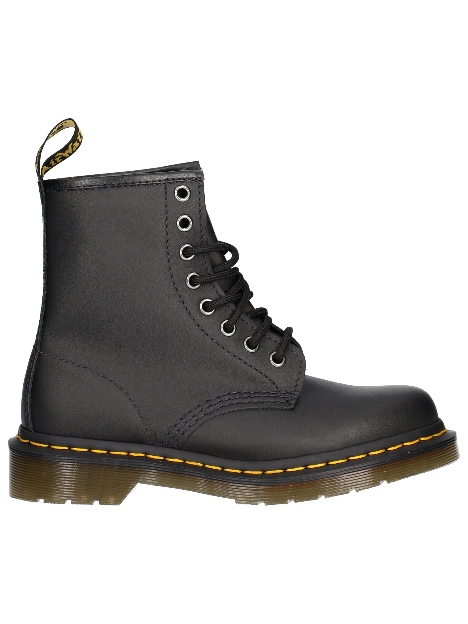 Anfibio Dr Martens 1460 nappa con guardolo Goodyear, cuciture gialle a vista e linguetta logata sulla parte superiore del tallone per facilitare la calzata. Otto occhielli con chiusura a stringhe tono su tono tripla cucitura della tomaia per una maggior resistenza e suola brevettata resistente ad olio, grasso e benzina. Fondo in gomma antiscivolo.