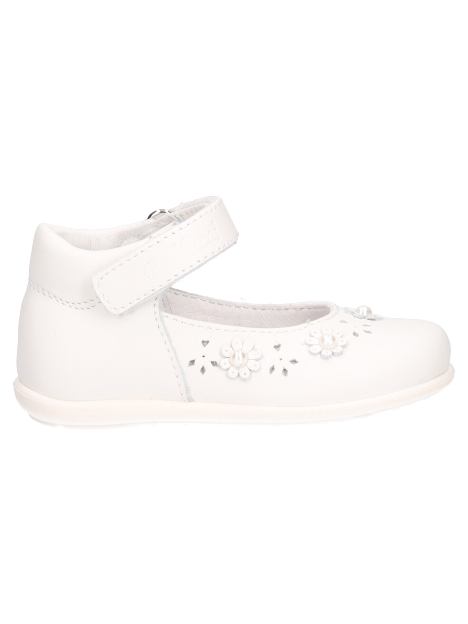 Ballerina Balducci da bambina in pelle bianca con fodera e sottopiede sempre in pelle e fondo in gomma antiscivolo.