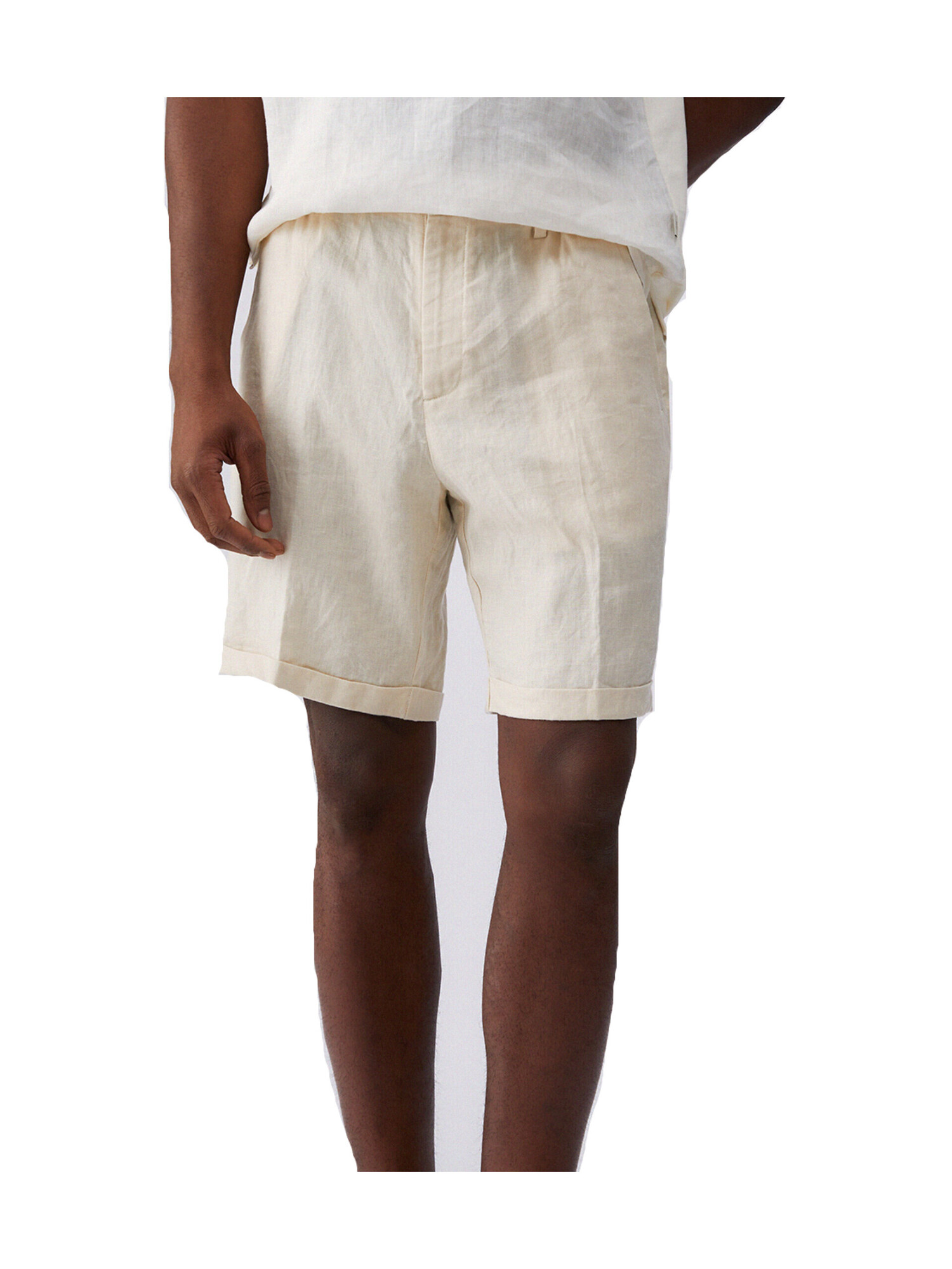 Pantaloncino Liu Jo da uomo in 100% lino avorio con risvolto al fondo, cintone elastico con coulisse e comode tasche.
