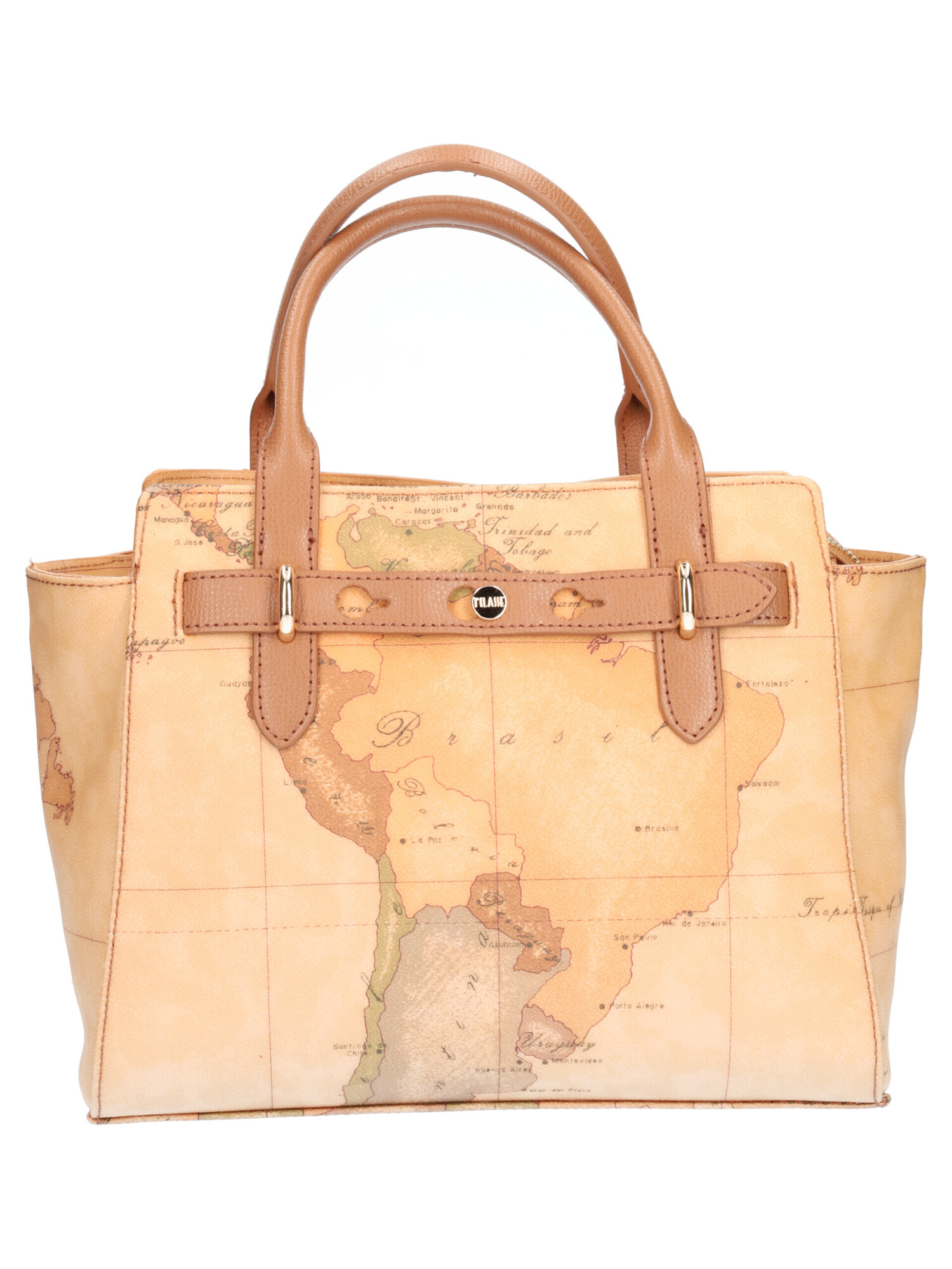 Borsa a mano Alviero Martini 1a Classe da donna in ecopelle geografica e pelle cuoio con doppio manico e tracolla regolabile in pelle cuoio e metalleria dorata. Zip centrale e taschini interni di servizio.