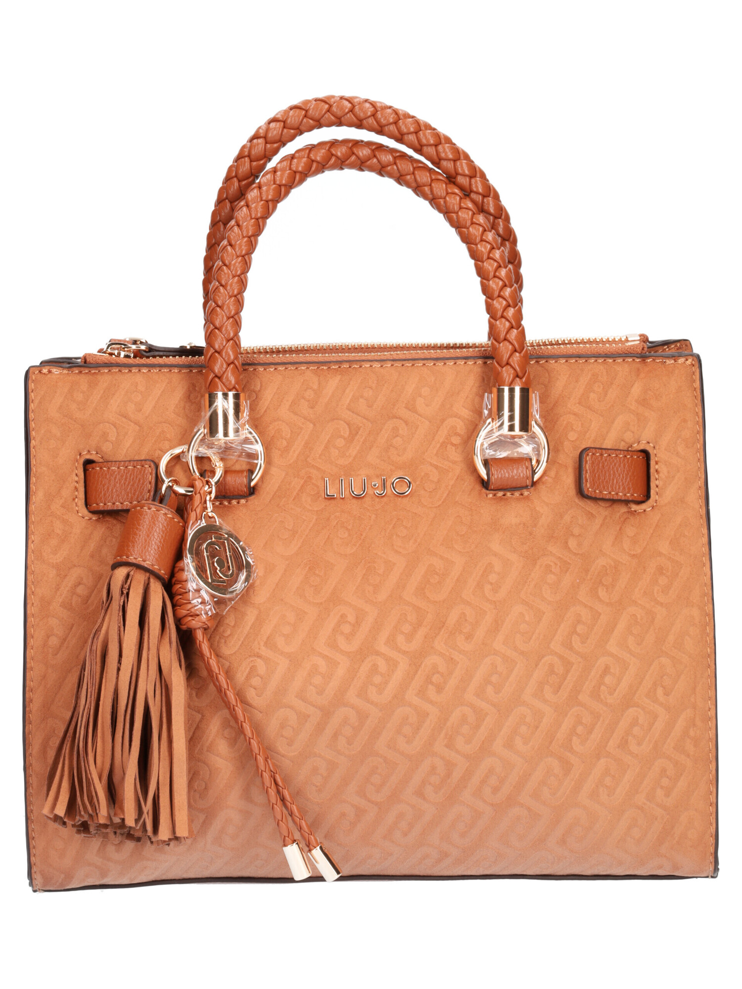 Borsa a mano Liu Jo da donna in similcamoscio monogram cuoio con rifiniture dorate, accessorio pendente removibile, doppio manico corto e tracolla regolabile in ecopelle cuoio. Borsa con due scomparti laterali con zip ed uno centrale con automatico taschini interni di servizio. Dimensioni: 26x20x12cm