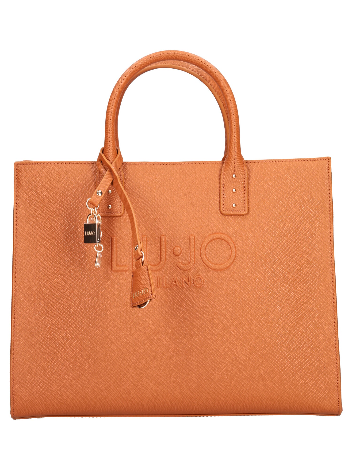 Borsa a mano Liu Jo da donna da donna in ecopelle cuoio stampa saffiano con rifiniture dorate e charm removibile. Borsa con doppio manico corto e tracolla regolabile in tessuto logato in tinta. Borsa con zip centrale e taschini interni di servizio. Dimensioni: 32x25x16cm