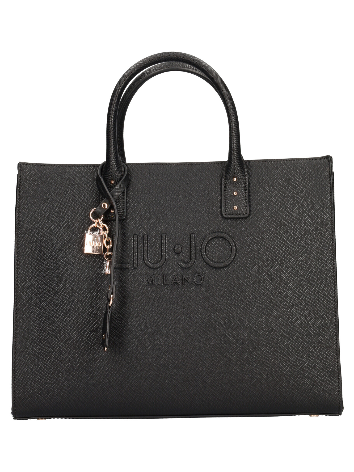 Borsa a mano Liu Jo da donna da donna in ecopelle nera stampa saffiano con rifiniture dorate e charm removibile. Borsa con doppio manico corto e tracolla regolabile in tessuto logato in tinta. Borsa con zip centrale e taschini interni di servizio. Dimensioni: 32x25x16cm