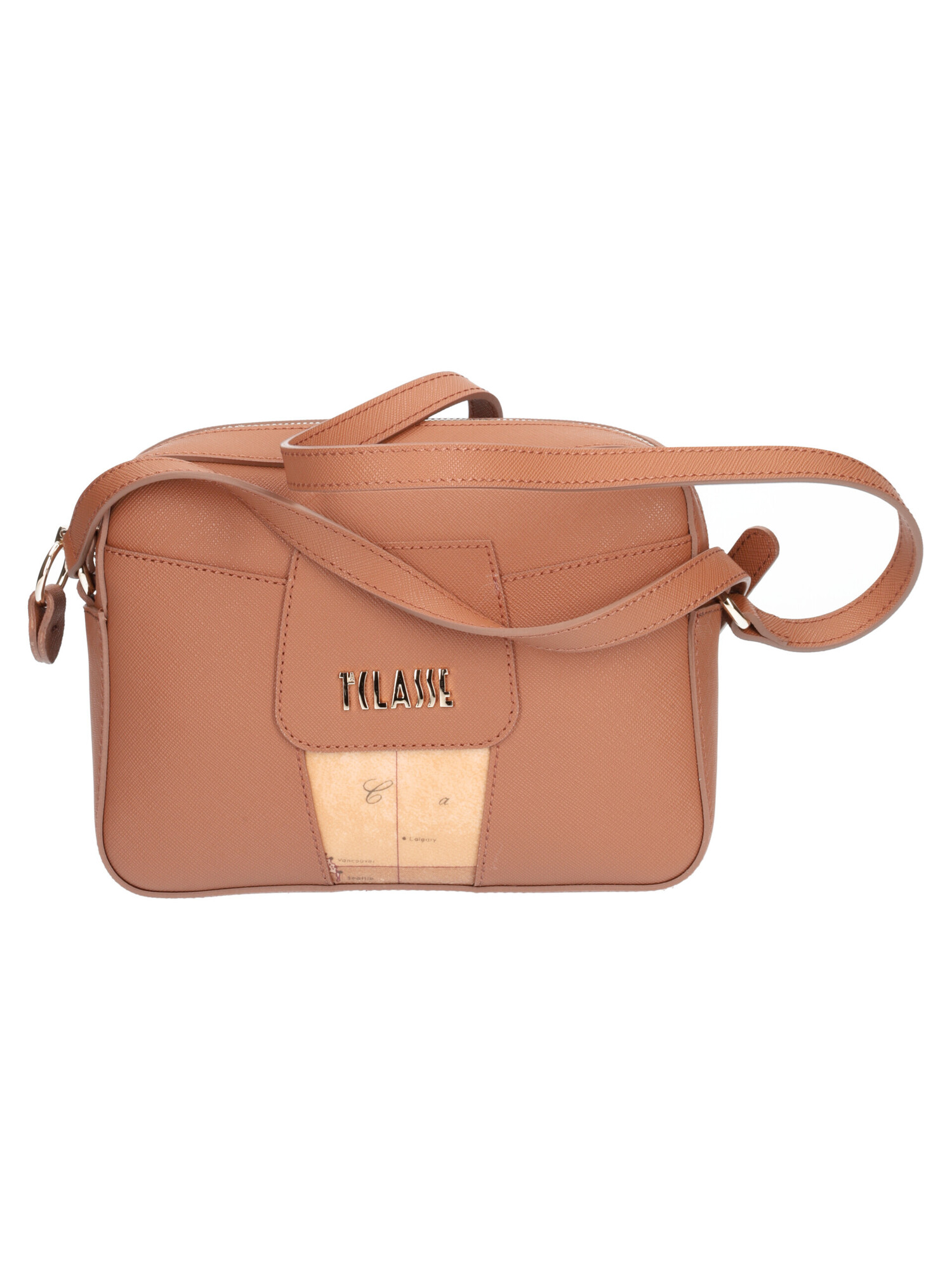 Borsa Alviero Martini 1a Classe da donna in ecopelle cuoio stampa saffiano e dettagli geo tracolla regolabile, zip centrale e taschini interni di servizio.
