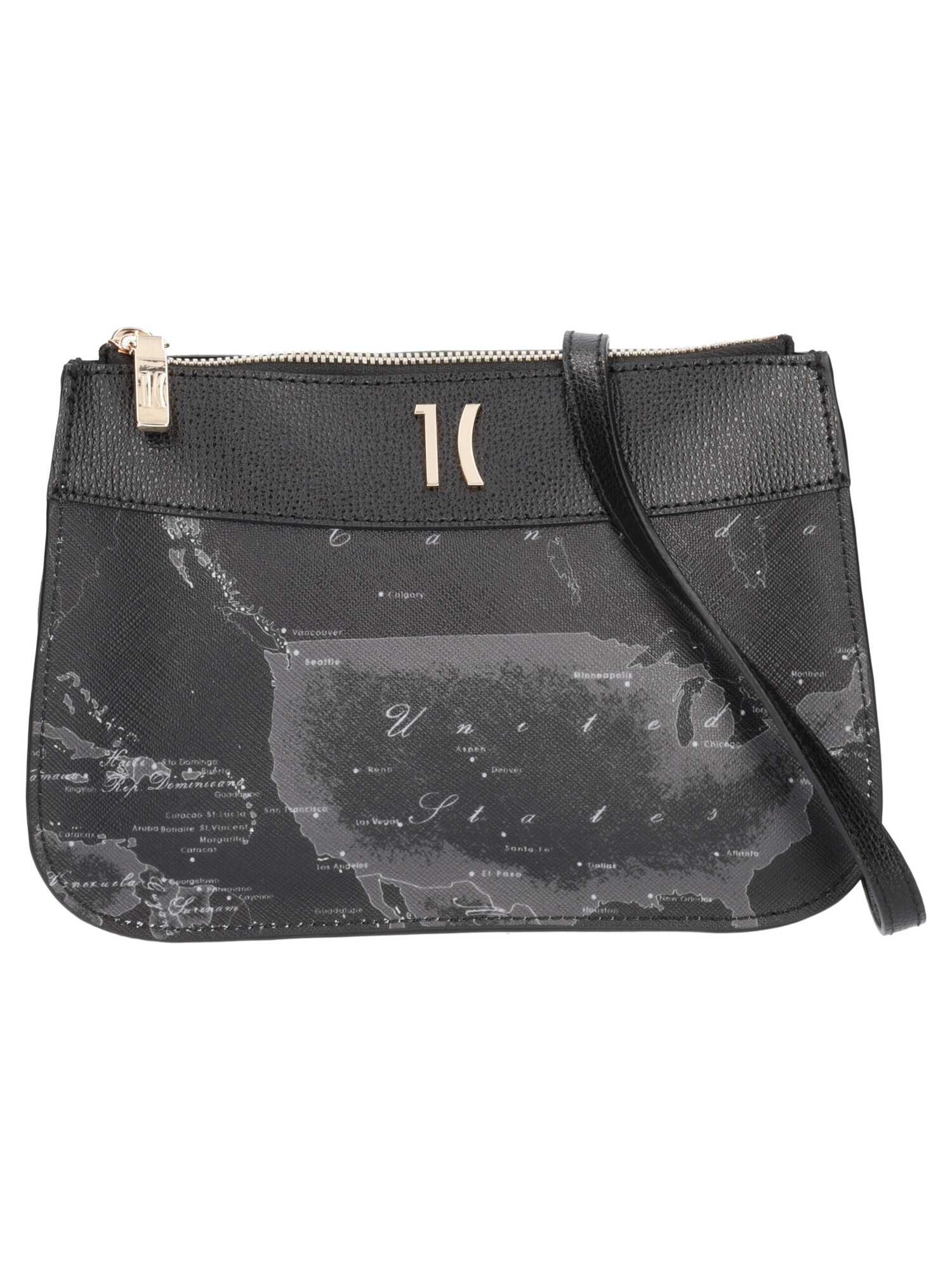 Borsetta Alviero Martini 1a Classe da donna in ecopelle nera geografica con dettagli e tracolla regolabile in pelle liscia e rifiniture dorate. Borsa con zip centrale, due scomprti interni e taschino di servizio.