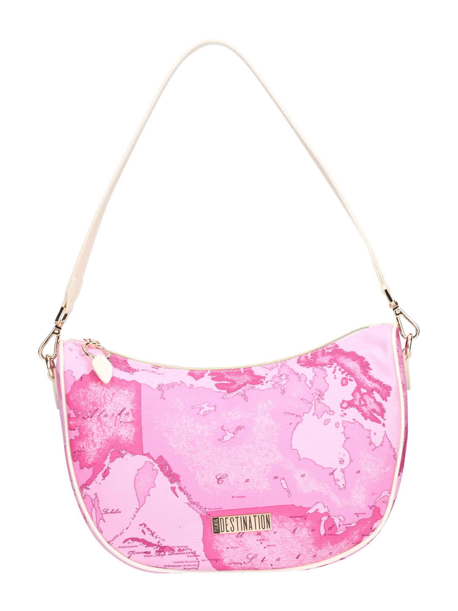Borsa mezzaluna Alviero Martini 1a Classe Destination da donna in tessuto geografico rosa e fucsia con manico in ecopelle e tracolla regolabile in tessuto logato avorio. Borsa con zip centrale e taschini interni di servizio.