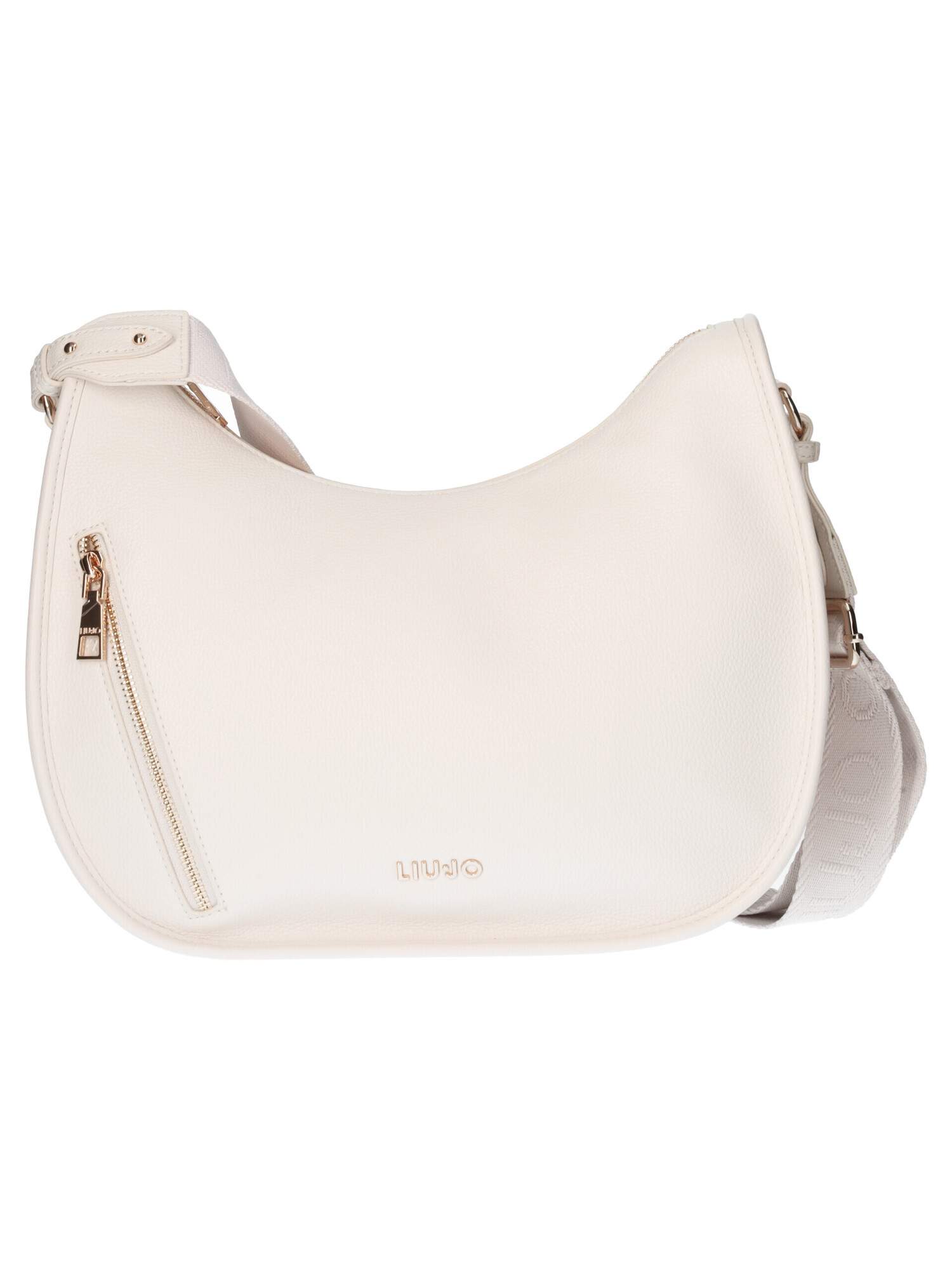Borsa mezza luna Liu Jo da donna in ecopelle avorio con rifiniture dorate e tracolla regolabile in tessuto logato zip centrale, taschino interno e taschini esterni.