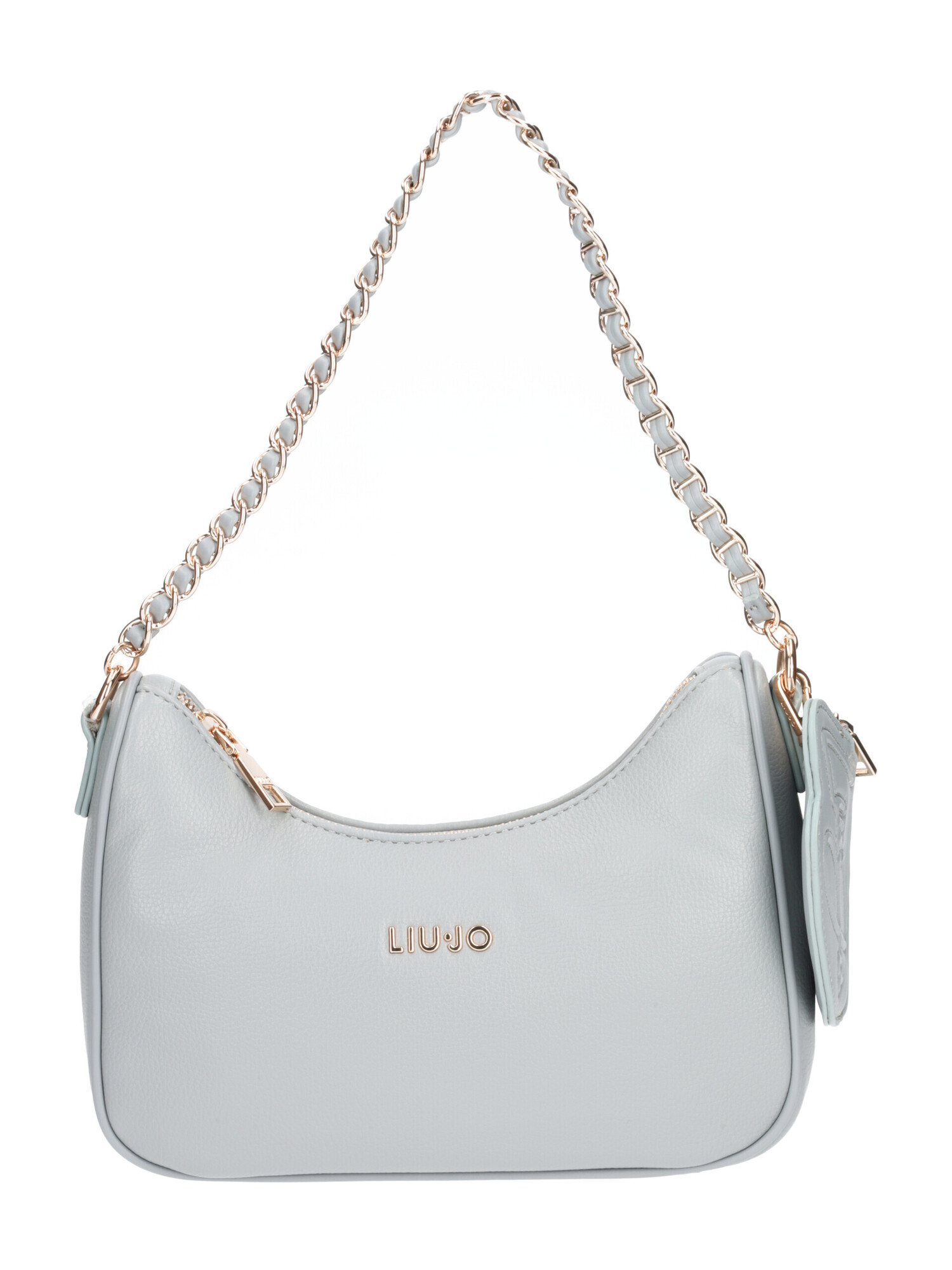 Borsa sottospalla Liu Jo da donna in morbida ecopelle martellata celeste polvere con manico di catena dorata e tracolla regolabile in tessuto logato celeste e beige. Borsellino removibile, zip centrale e taschini interni di servizio. Dimensioni: 22x17x8cm