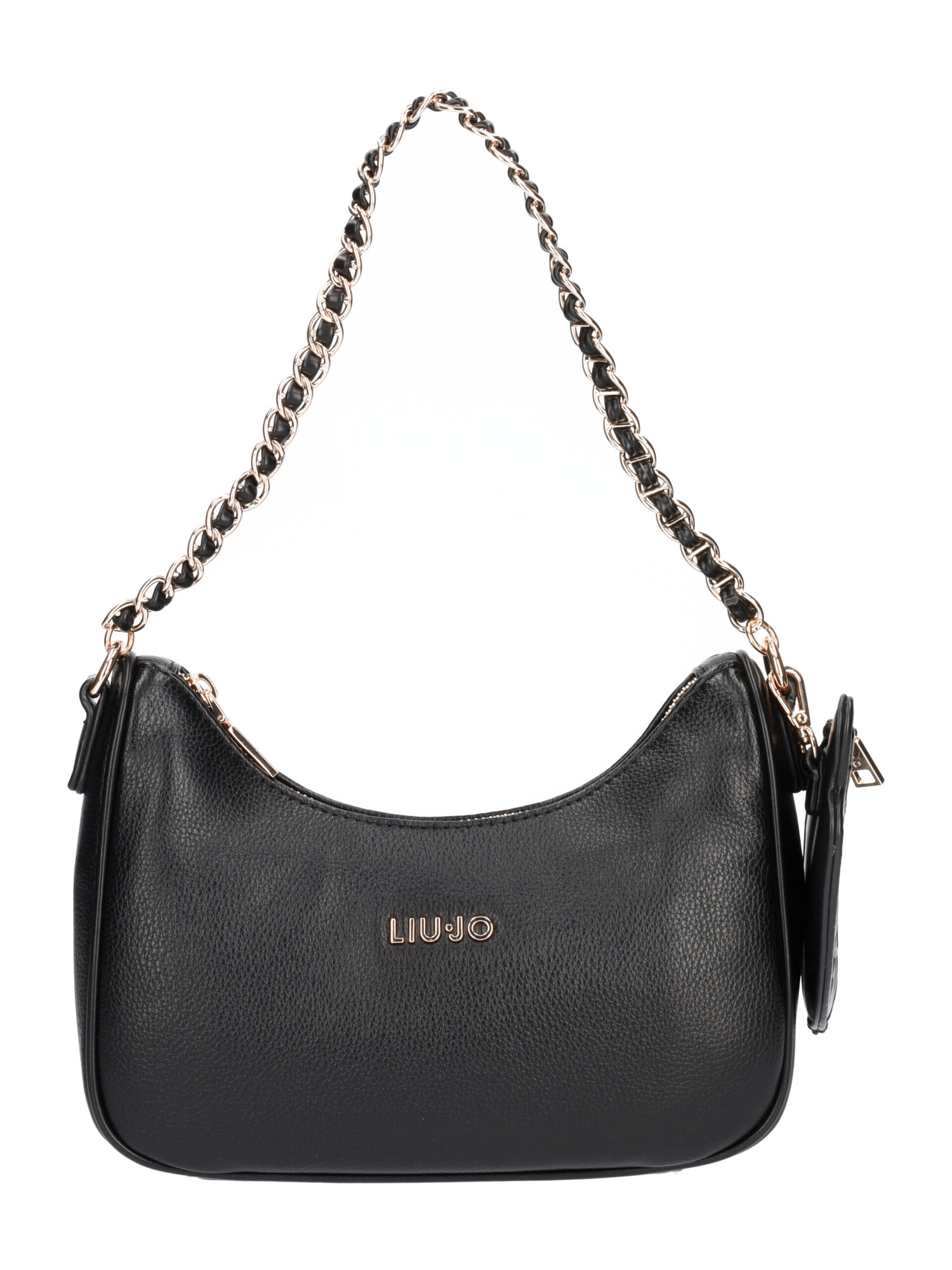 Borsa sottospalla Liu Jo da donna in morbida ecopelle martellata nera con manico di catena dorata e tracolla regolabile in tessuto logato nero e beige. Borsellino removibile, zip centrale e taschini interni di servizio.