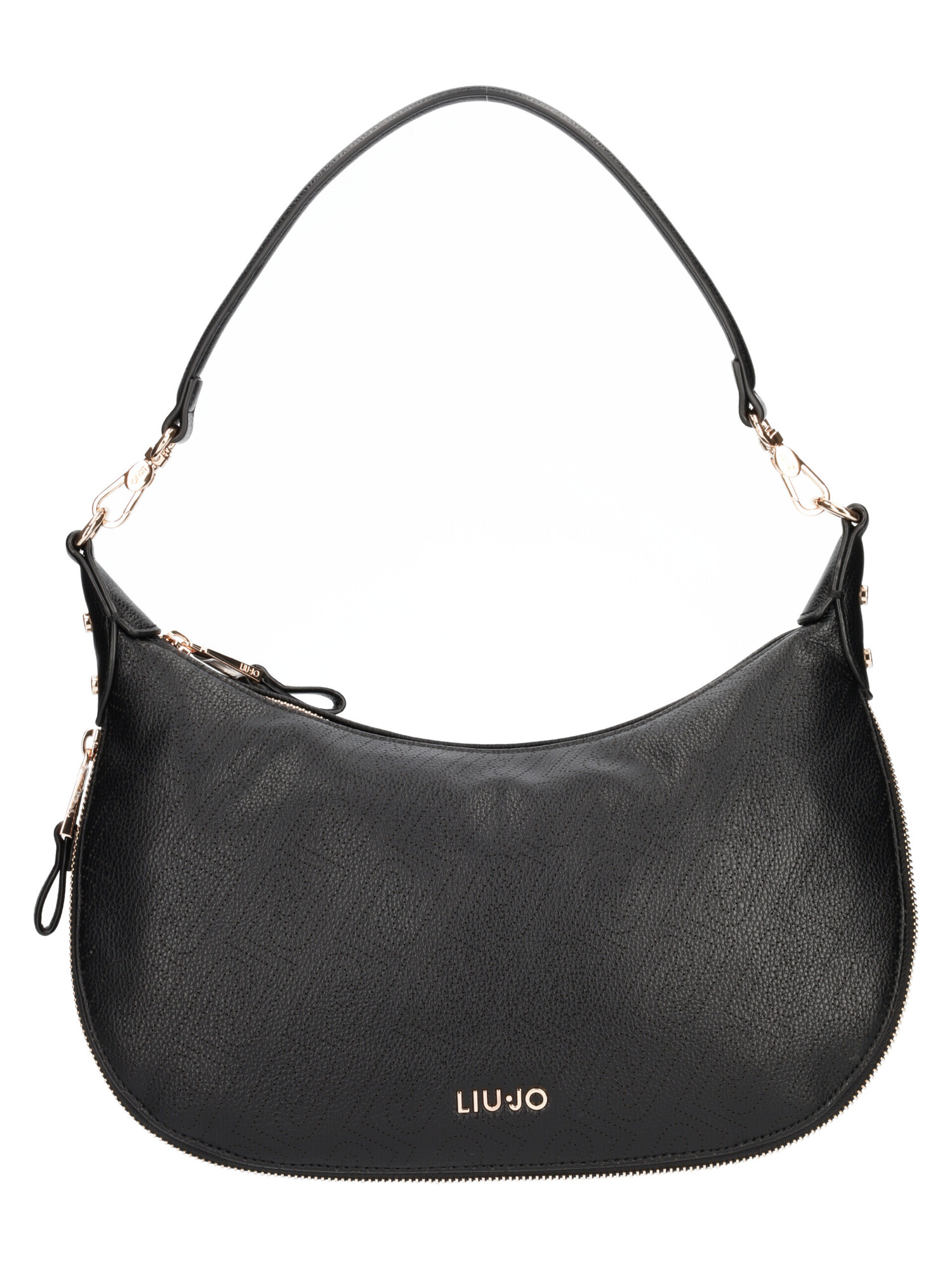 Shopping bag Liu Jo da donna in morbida ecopelle nera monogram con rifiniture dorate, manico e tracolla regolabile in tessuto in tinta. Borsa con zip centrale e taschini interni di servizio soffietto al fondo con zip per stringere la borsa. Dimensioni: 32x20x10cm