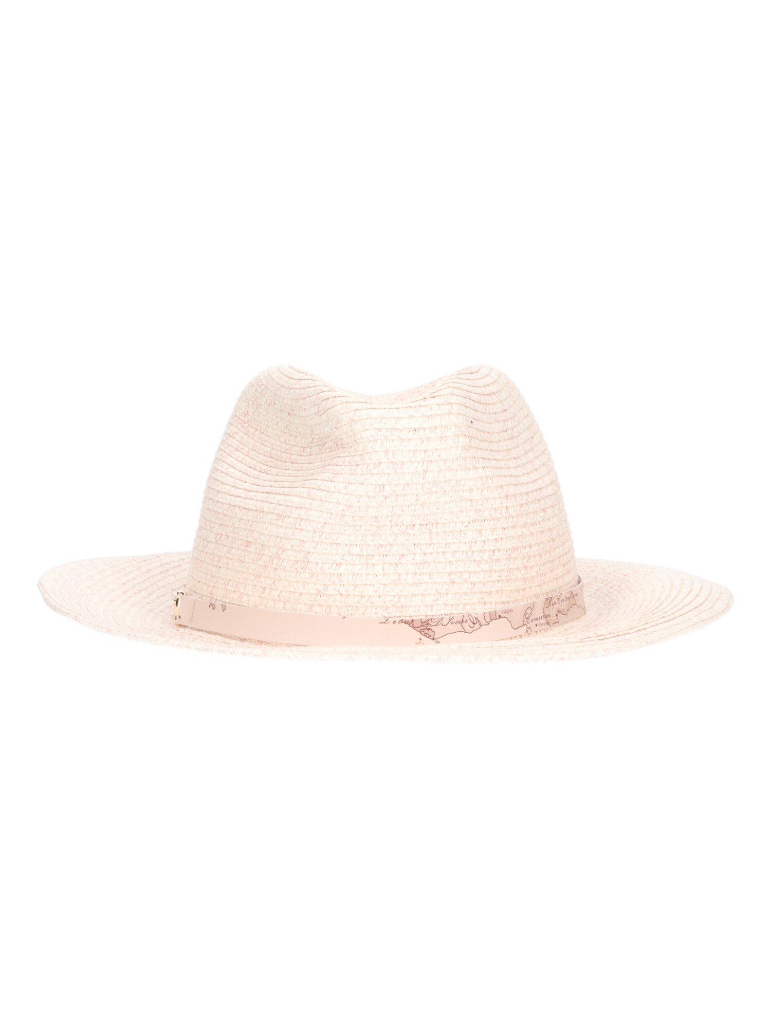 Cappello Alviero Martini Prima Classe da donna beige ed inserti rosa con morsetto dorato e dettaglio geografico beige.