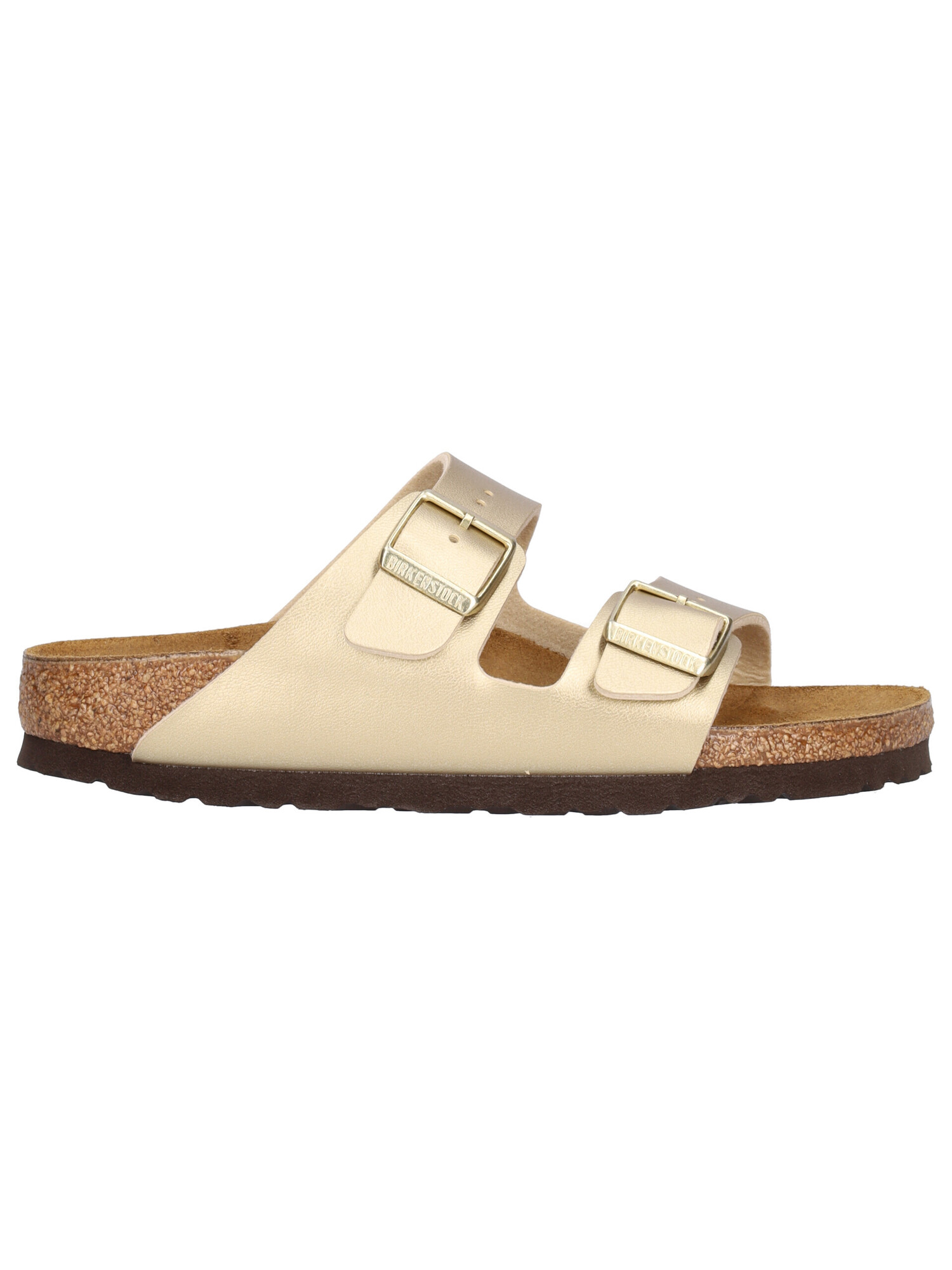 Ciabatta Birkenstock Arizona da donna in ecopelle oro con doppia fascia regolabile e fodera in tessuto. Sandalo Birkenstock con sottopiede in pelle con forma del plantare e fondo in gomma antiscivolo.