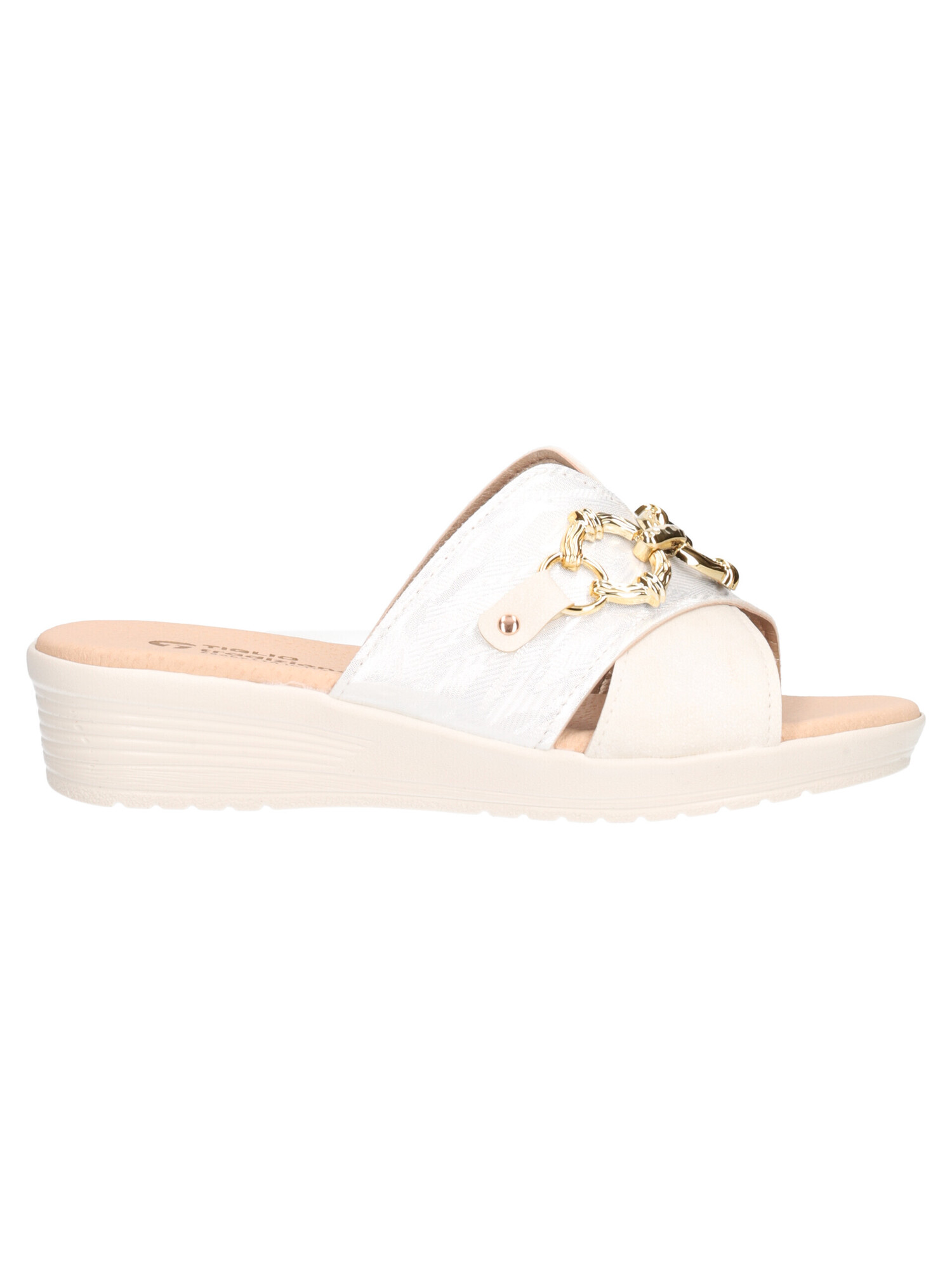 Ciabatta Tiglio da donna in ecopelle argento con metalleria dorata, sottopiede in vera pelle e fondo in gomma con zeppa di 4cm.