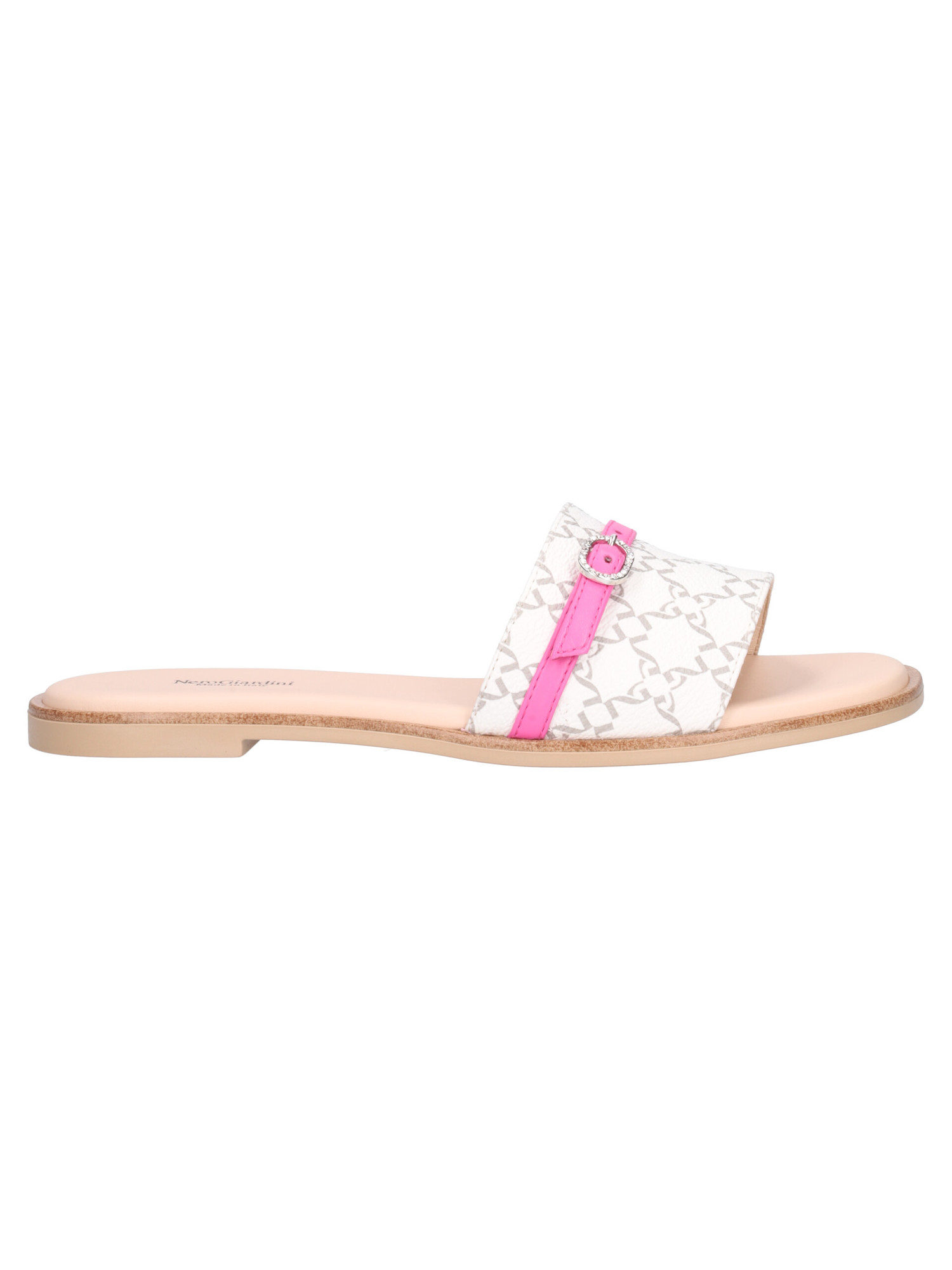 Sandalo Nero Giardini da donna in ecopelle logata bianca con dettagli in pelle fucsia fodera e sottopiede in pelle e fondo in gomma.