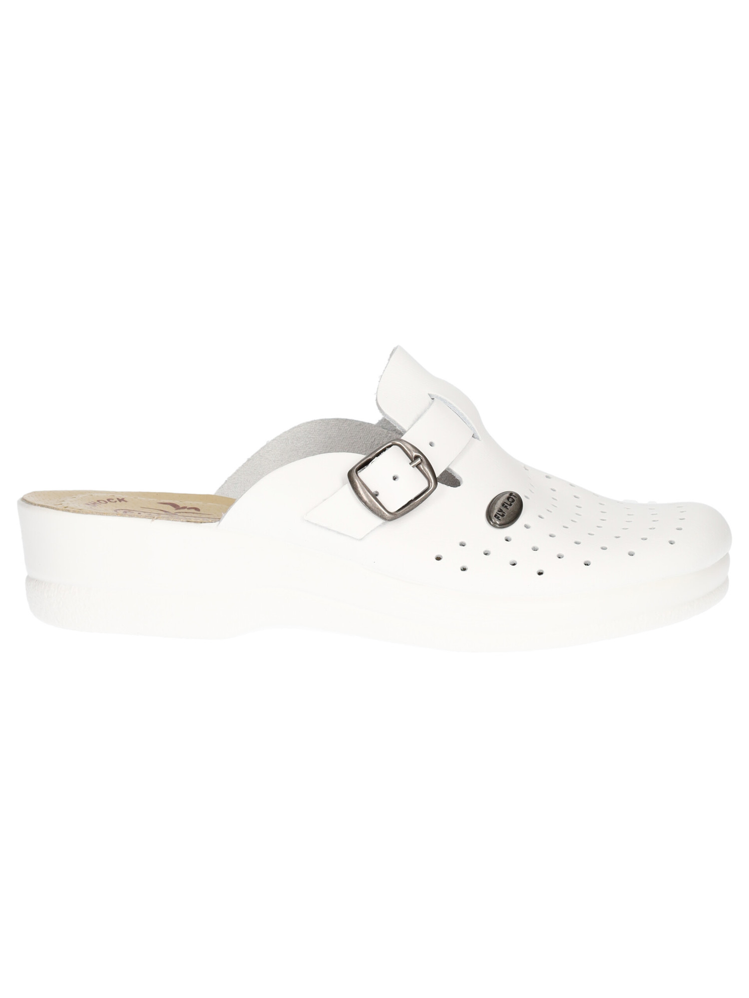 Ciabatta sanitaria Fly Flot in pelle bianca con sottopiede anti-shock in morbido pellame. Traforata, con fibbia regolabile e fondo in gomma antiscivolo con tacco di 4cm.
