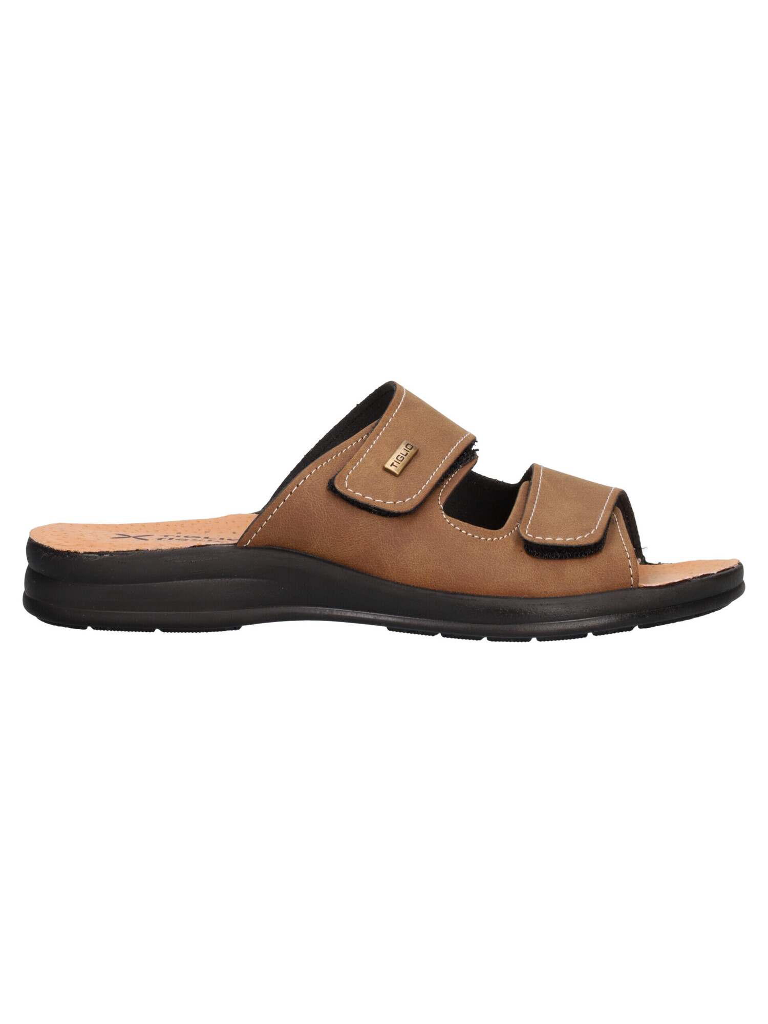 Ciabatta Tiglio da uomo in ecopelle marrone con stretch regolabili, sottopiede in vera pelle e fondo in gomma.