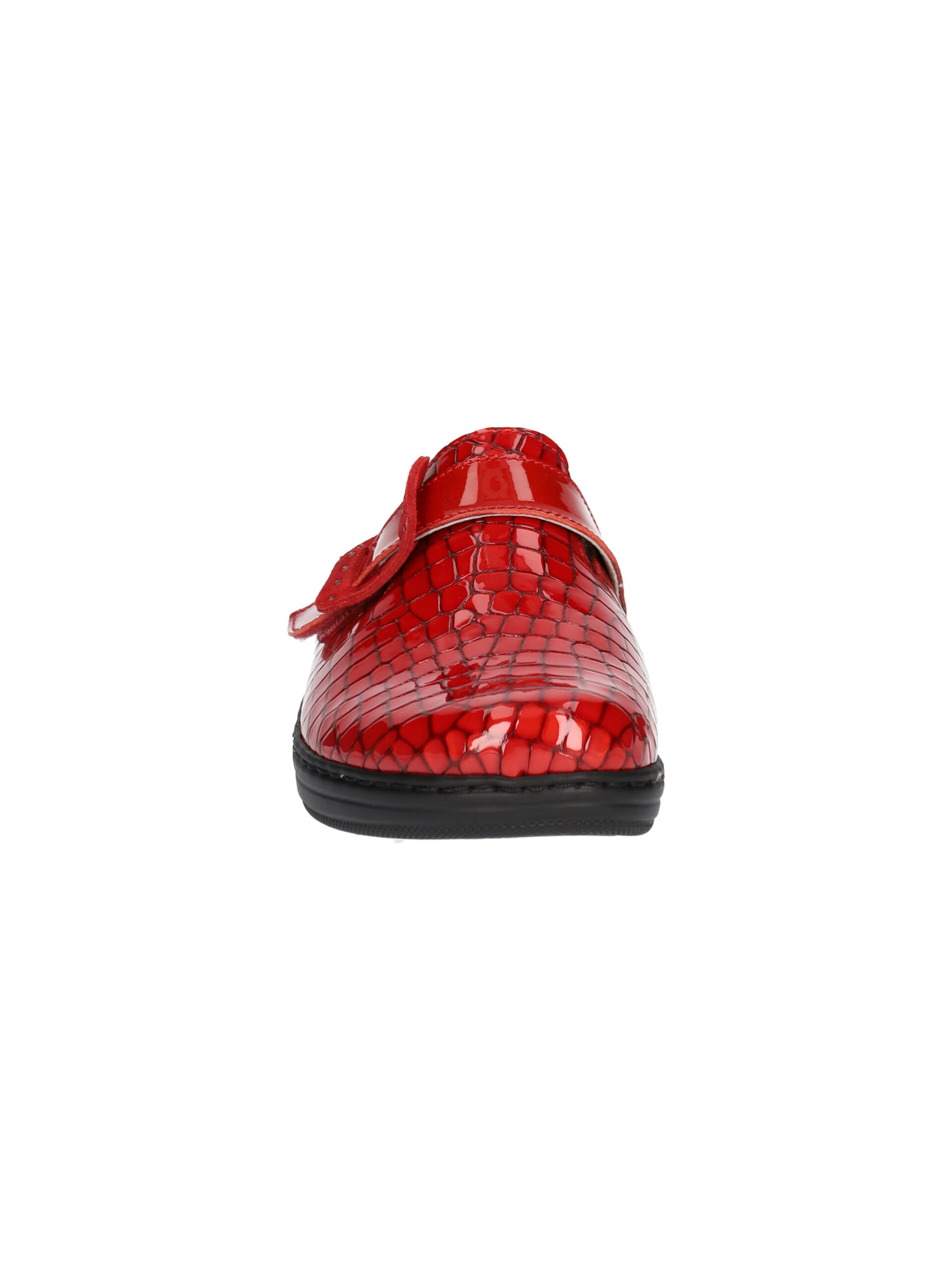 Ciabatta Susimoda da donna in morbida pelle rossa lucida con stampa rettile, fascia regolabile in vernice con inserto in camoscio. Fodera in tessuto e plantare estraibile in pelle fondo in gomma antiscivolo con zeppa di 4,5cm.