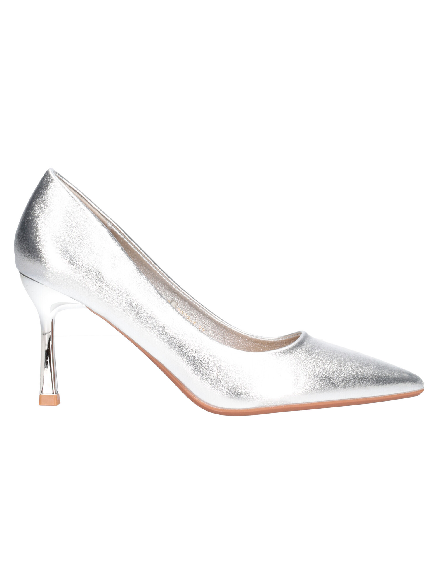 Decollete a punta Marina Torres da donna in ecopelle laminata argento con sottopiede imbottito in vera pelle, fondo in gomma e tacco specchio di 8cm.
