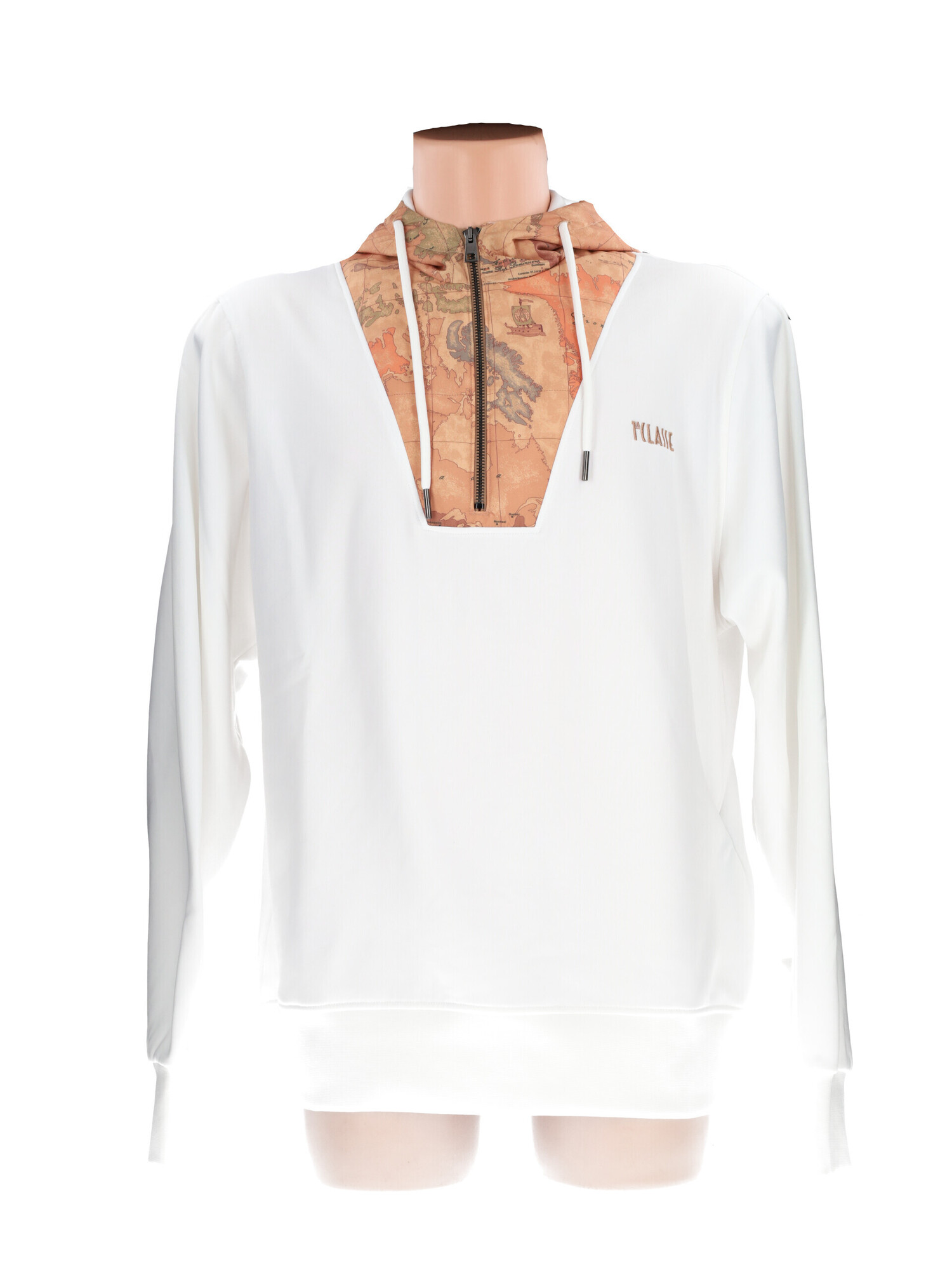 Felpa con mezza zip Alviero Martini 1a Classe da uomo in tessuto tecnico bianco con cappuccio e stampa geografica. Elastico al fondo ed ai polsi felpata all'interno.