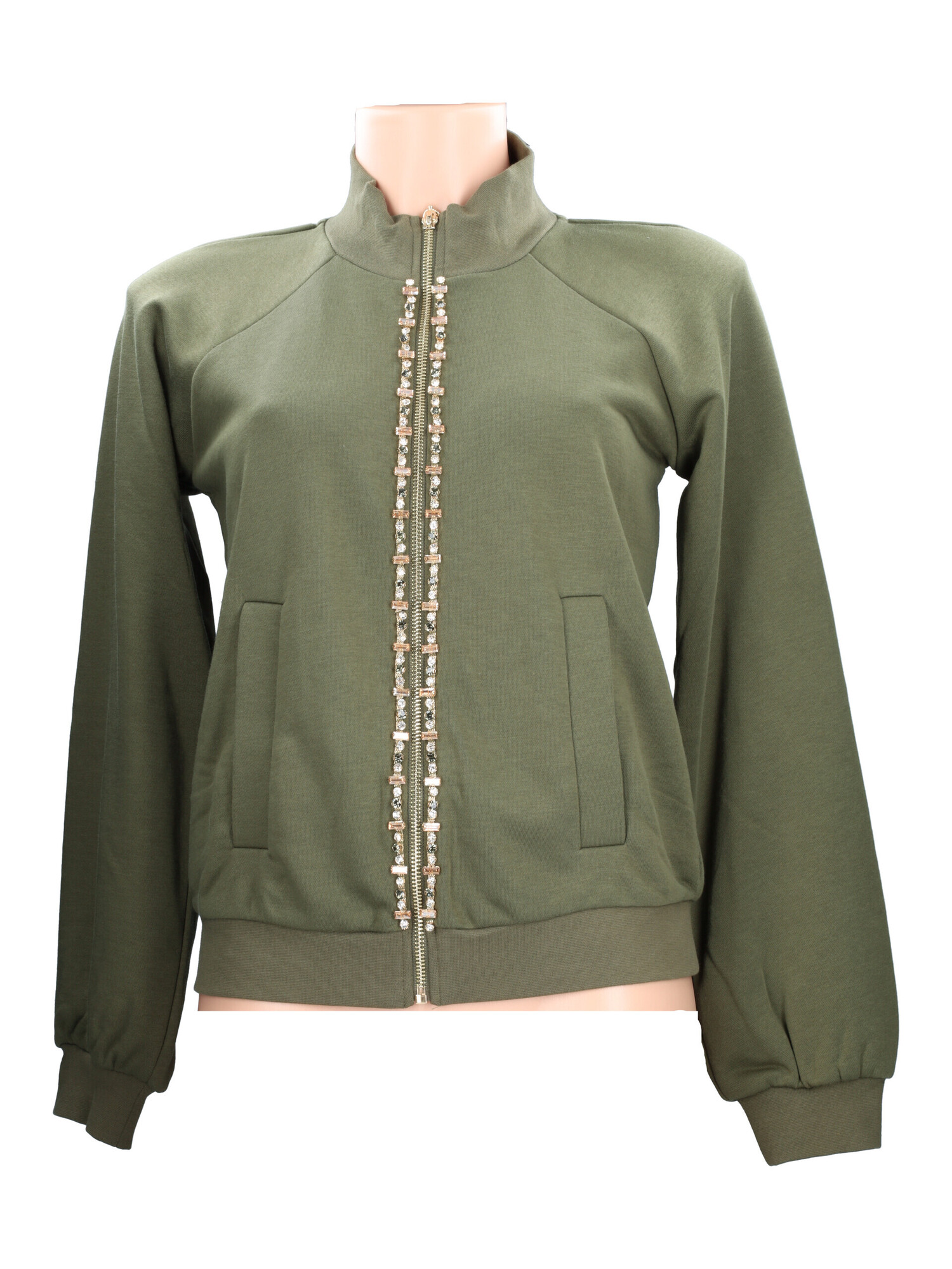 Felpa aperta Liu Jo da donna in misto cotone verde con strass frontali, collo alto e chiusura con zip maniche lunghe raglan.