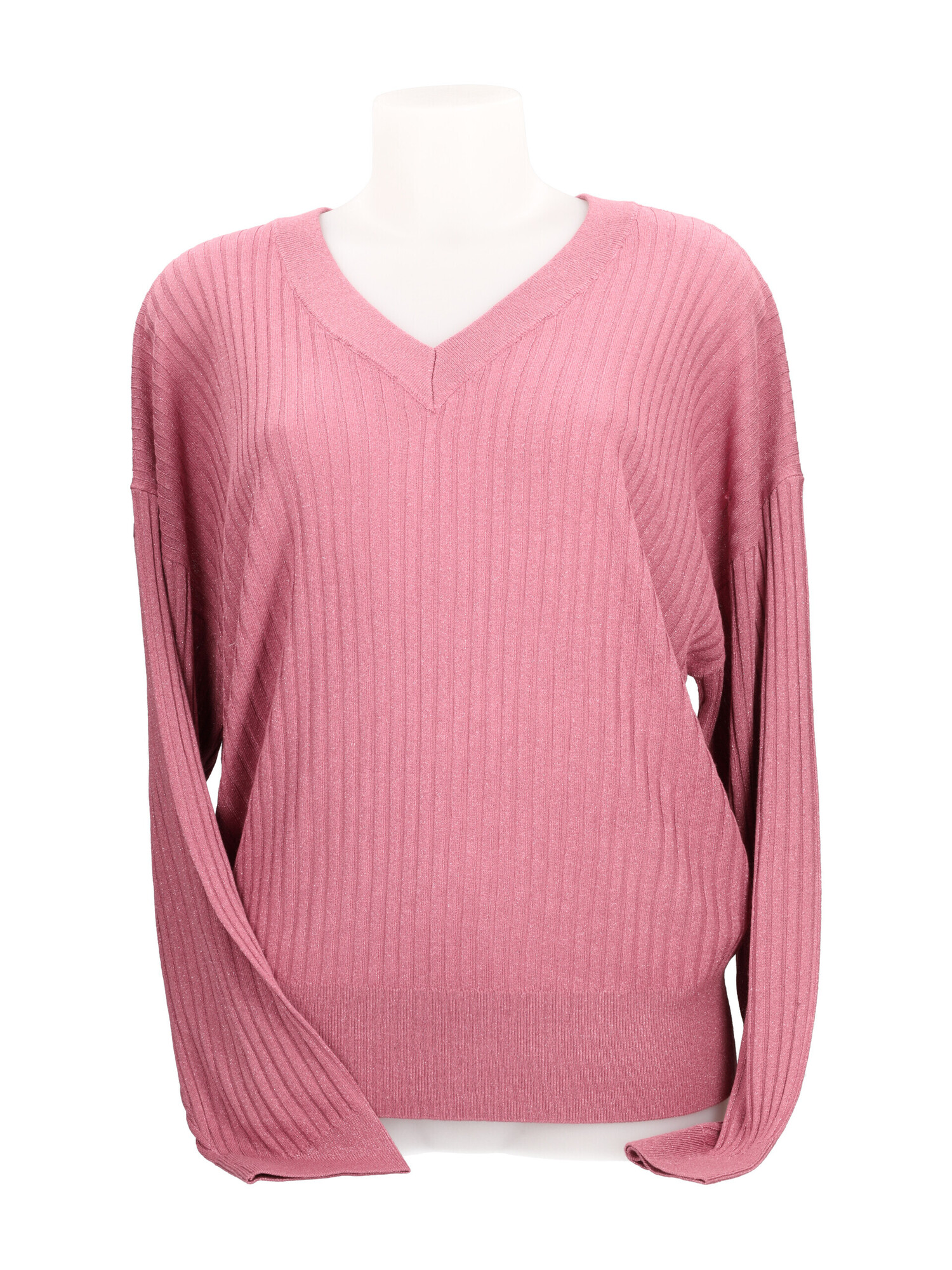Maglioncino Liu Jo da donna in misto viscosa rosa con interventi in lurex, lavorazione a coste e scollo a V.