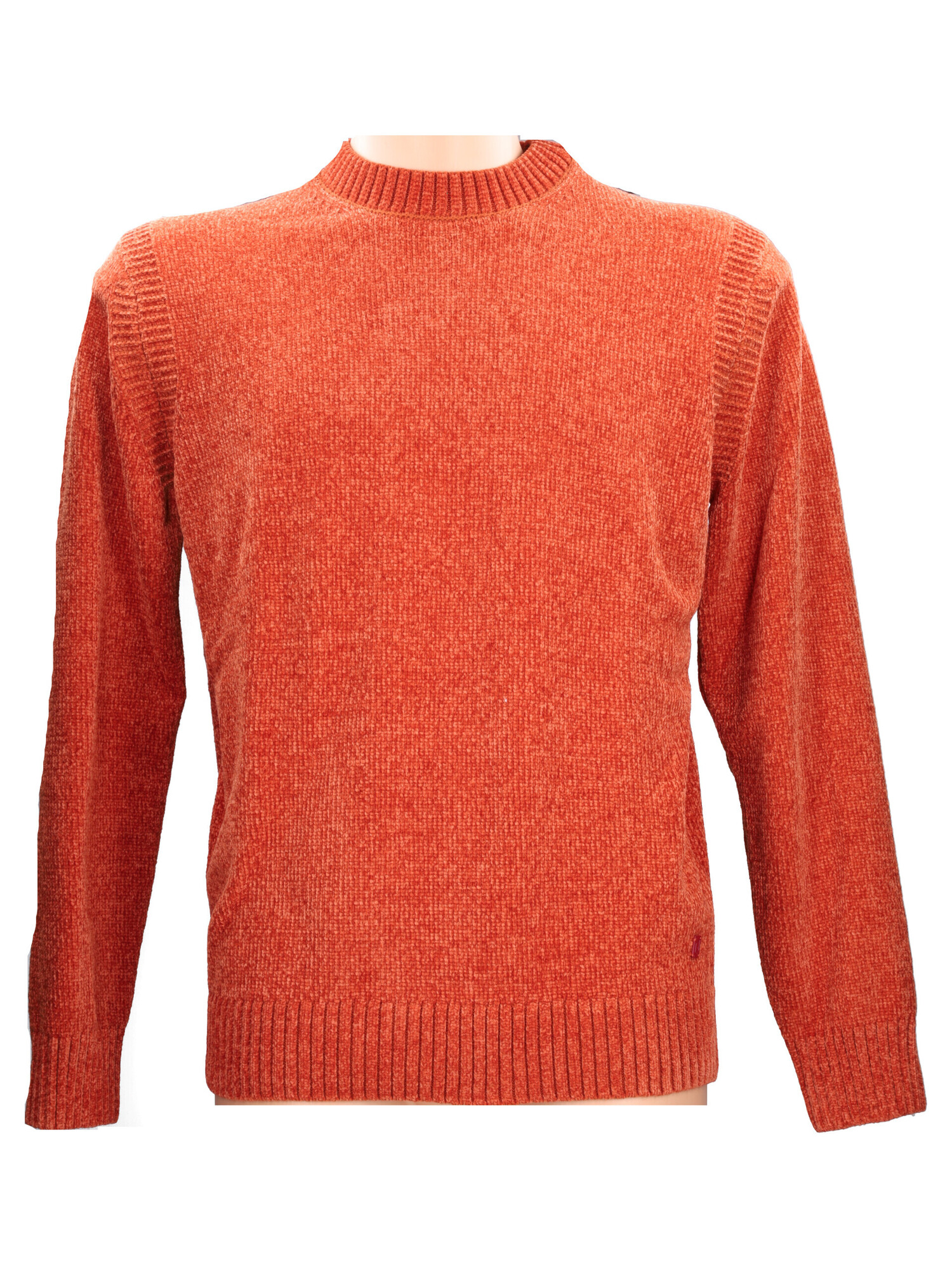 Maglione Liu Jo da uomo in ciniglia arancione con taglio girocollo, maniche lunghe, bordi a costine e logo al fondo.