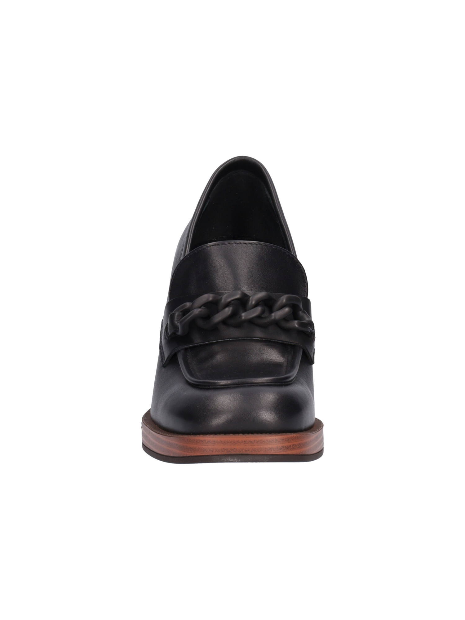 Mocassino Nero Giardini da donna in pelle nera impreziosita da catena in tinta e punta quadrata. Sottopiede sempre in pelle con fondo in gomma e tacco di 8cm.