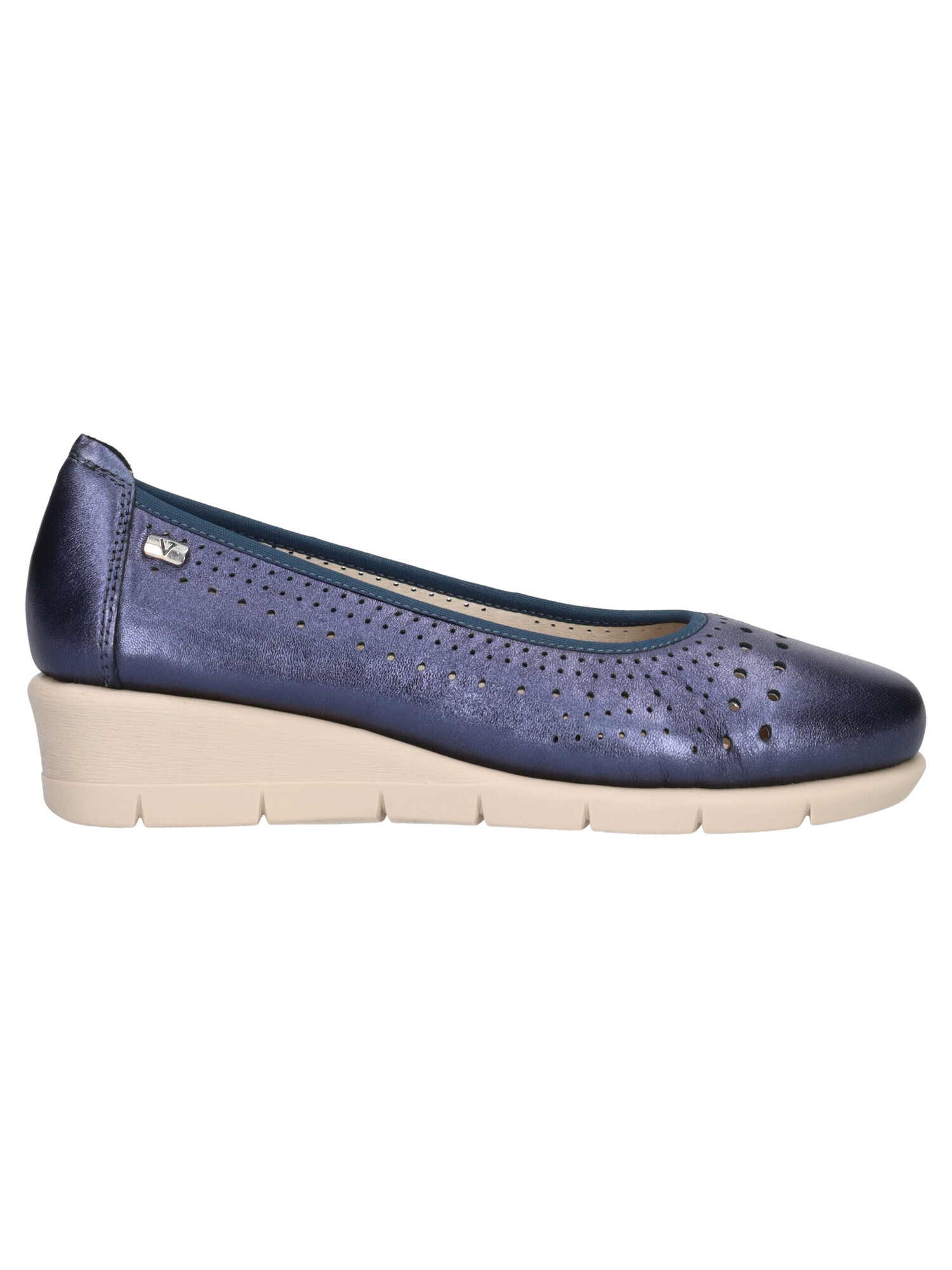 Mocassino Valleverde da donna in morbida pelle traforata e laminata blu con sottopiede sempre in pelle, fondo in gomma antiscivolo e zeppa di 4cm.