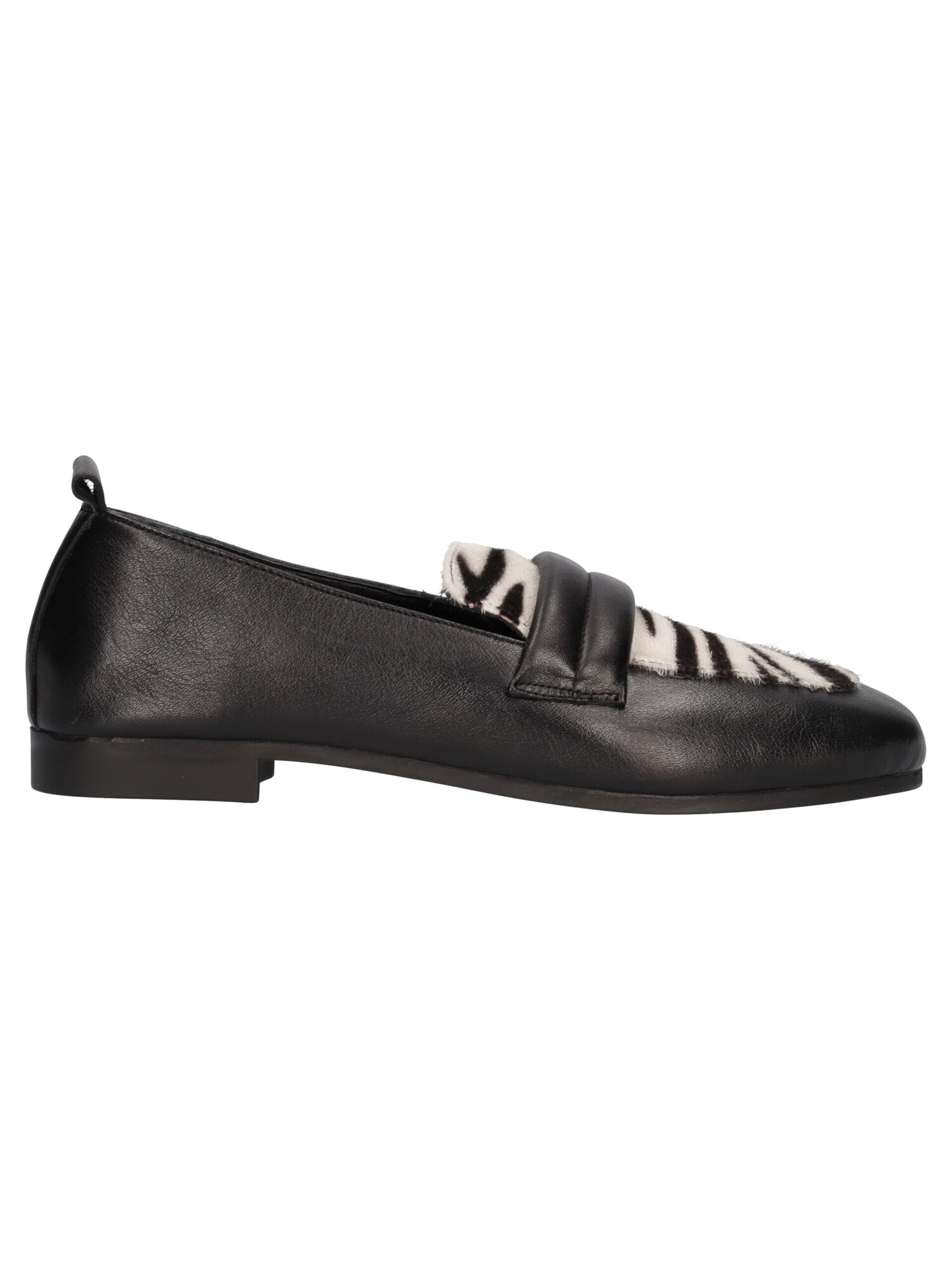 Mocassino Daphne da donna in morbida pelle nera con dettaglio in cavallino zebrato, fodera e sottopiede sempre in pelle e fondo in gomma.
