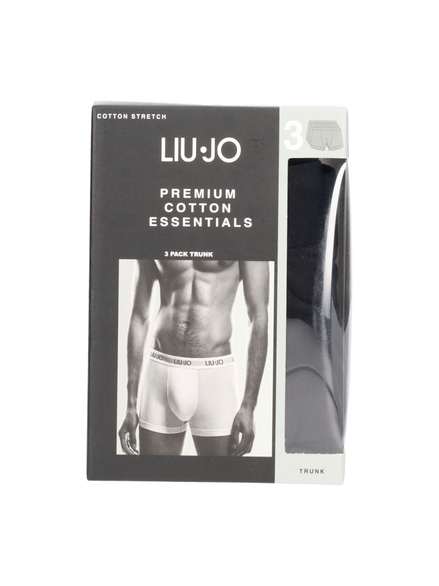 Tre slip Liu Jo da uomo in cotone nero con elastico in vita con logo grigio. La foto presente sulla scatola indica solo il modello, il colore del logo è quello che si vede dal lato trasparente della scatola. Questo prodotto non può nè essere reso nè essere sostituito.