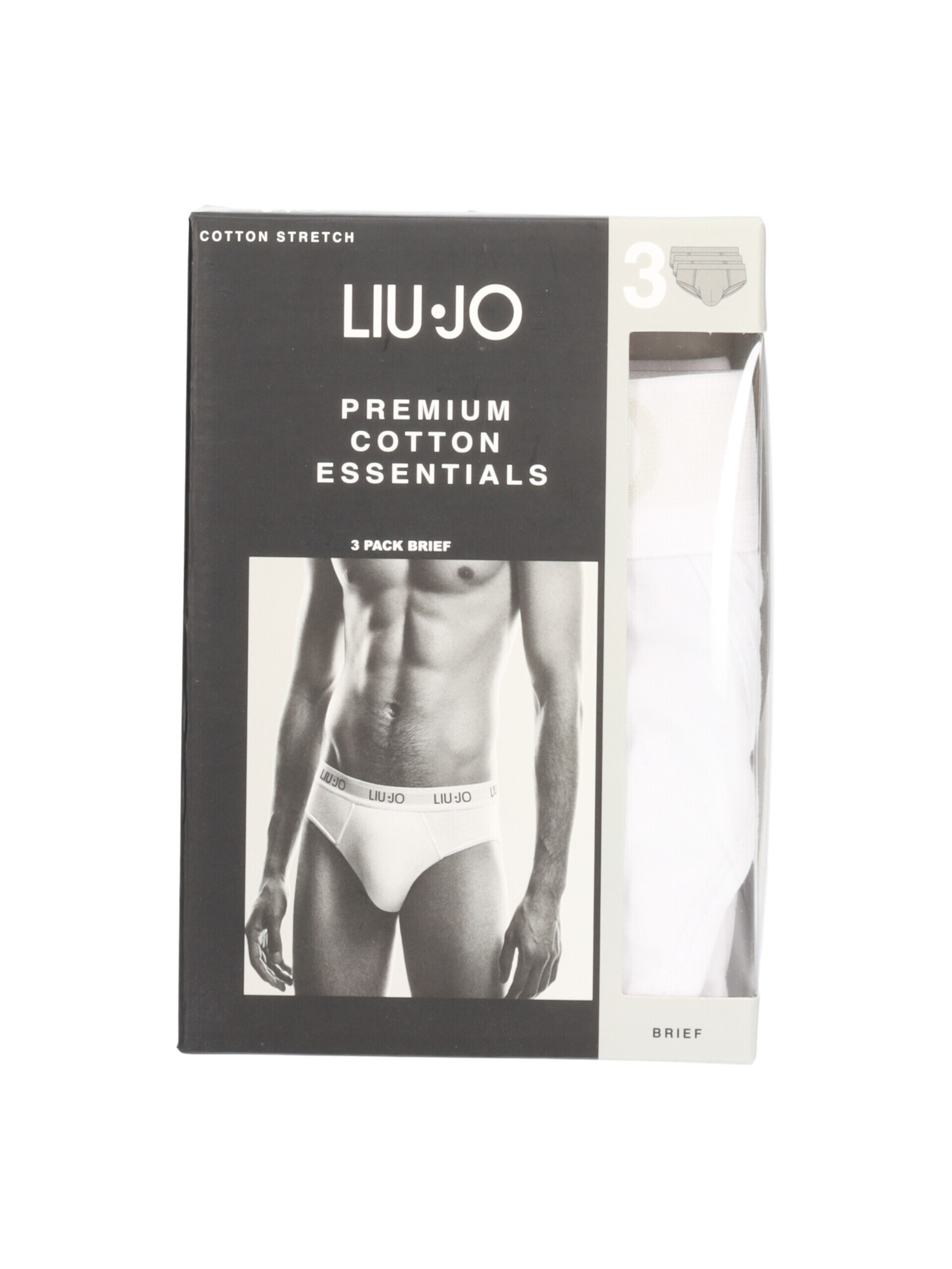 Tre slip Liu Jo da uomo in cotone bianco con elastico in vita con logo avorio. La foto presente sulla scatola indica solo il modello, il colore del logo è quello che si vede dal lato trasparente della scatola. Questo prodotto non può nè essere reso nè essere sostituito.