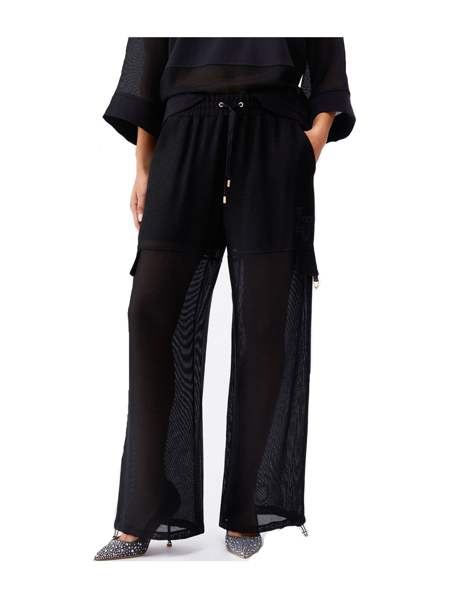 Pantalone cargo Liu Jo da donna in mesh misto viscosa nera con fodera a pantaloncino in cotone, cintone con coulisse, tasche cargo e fondo con coulisse per stringere ed allargare.