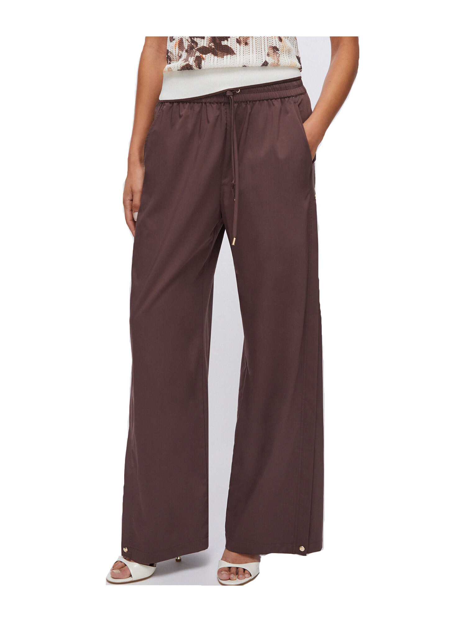 Pantalone Liu Jo da donna in filati misto bambù marrone con gamba ampia e spacchetti, cintone elastico in vita con coulisse comode tasche e bottoni decorativi sul fondo.