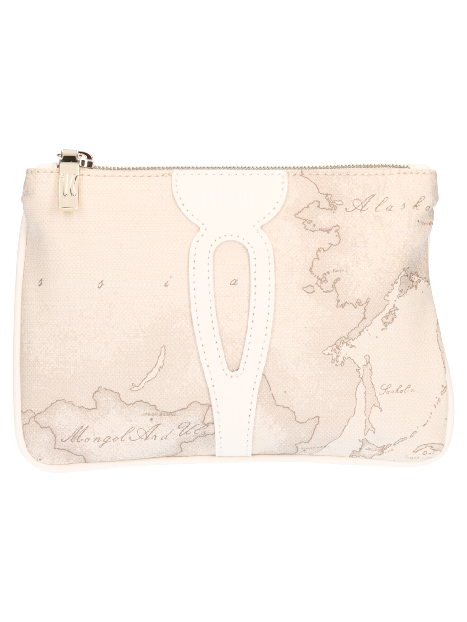 Pochette Alviero Martini 1a Classe da donna in tessuto geografico beige e pelle avorio con dettagli dorati, zip centrale e taschino interno.