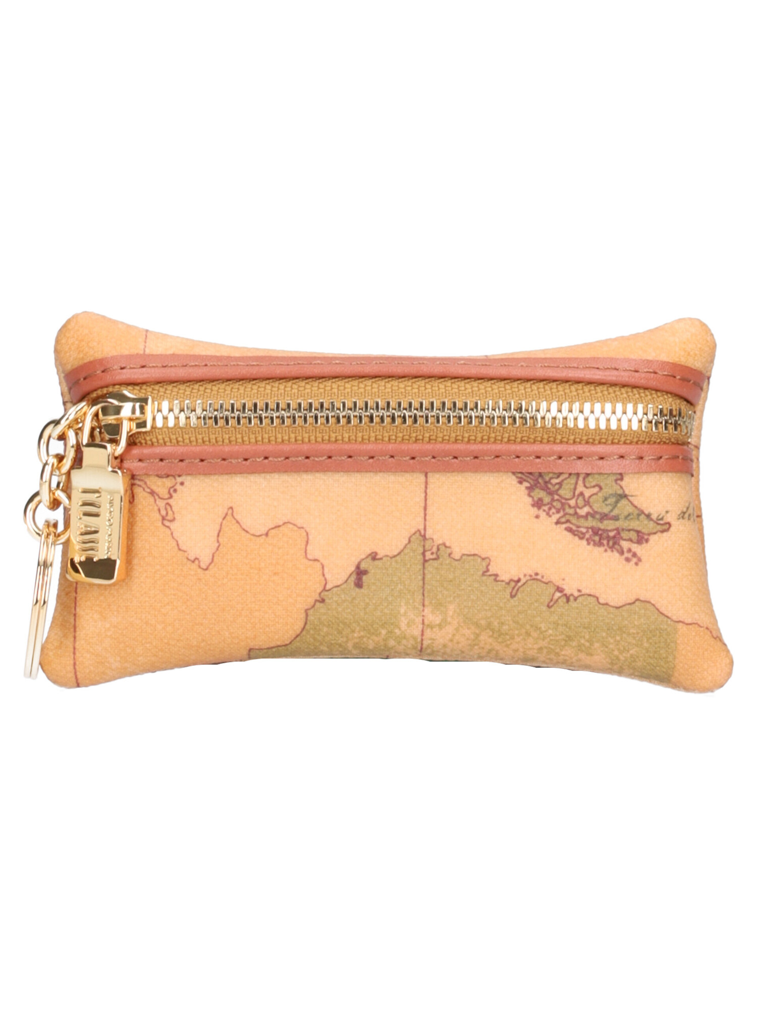 Portachiavi Alviero Martini 1a Classe unisex in ecopelle geografica con dettagli in pelle cuoio, rifiniture dorate e zip.