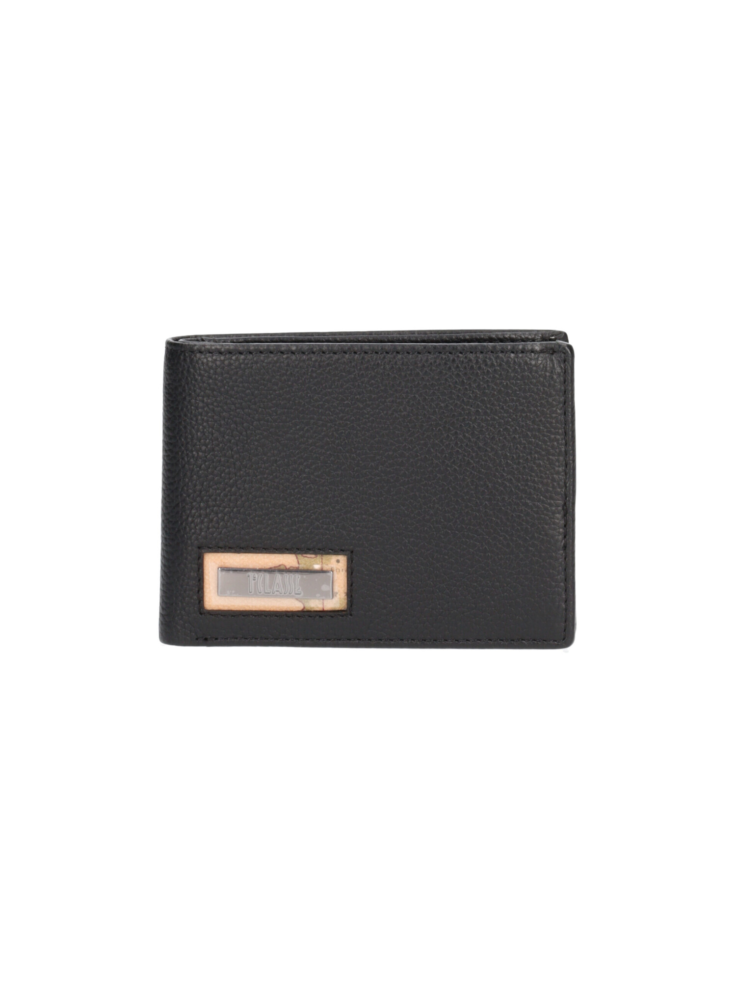 Portafoglio Alviero Martini 1a Classe da uomo in pelle martellata nera con dettaglio in ecopelle geografica. Scomparti per carte, banconote e tasca con zip per le monete.