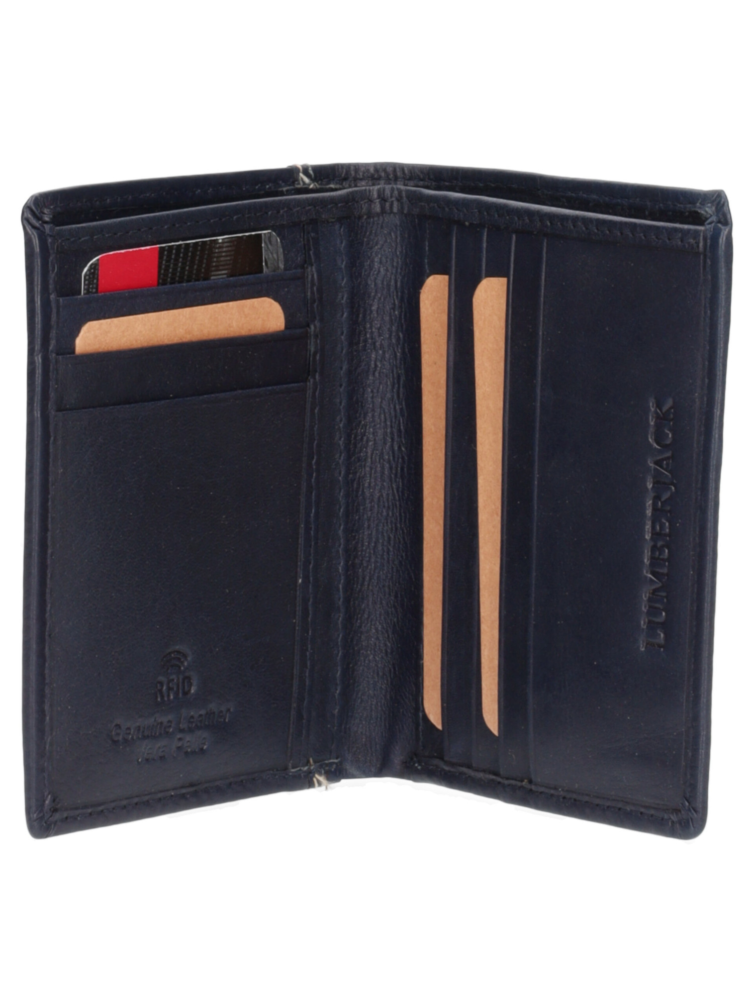 Portafoglio Lumberjack da uomo in pelle blu con sistema RFID, scomparti per carte e banconote.