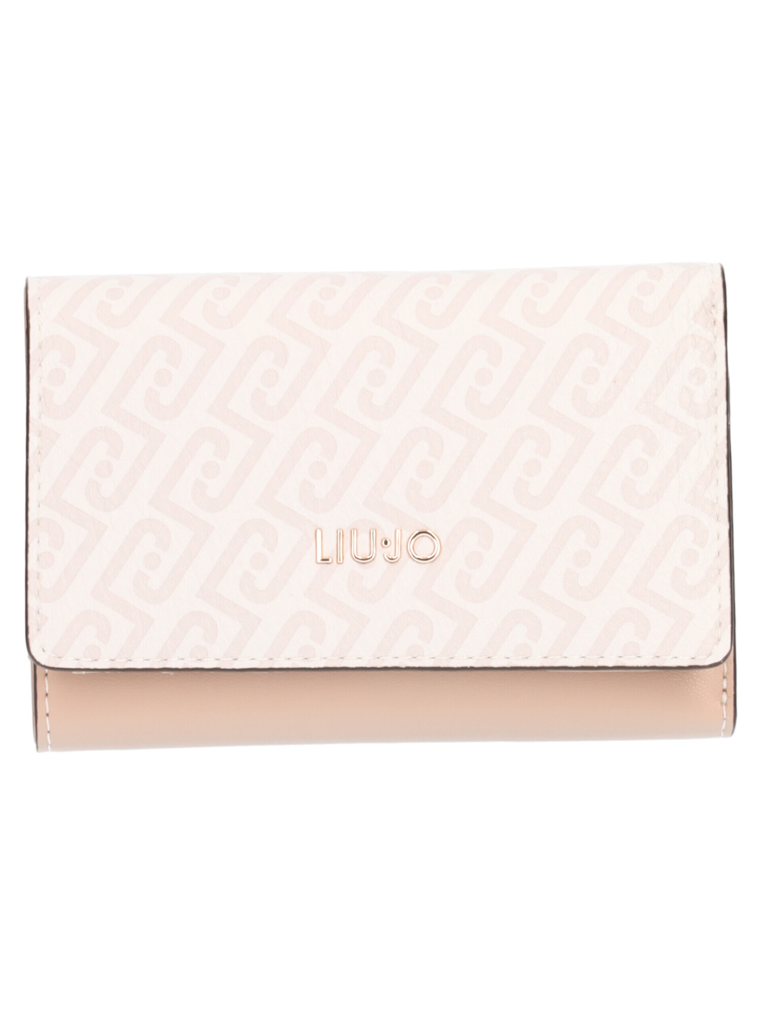 Portafoglio M Liu Jo da donna in ecopelle logata beige e avorio con rifiniture dorate, chiusura con bottone e scomparti per carte e banconote e tasca posteriore con zip per le monete.