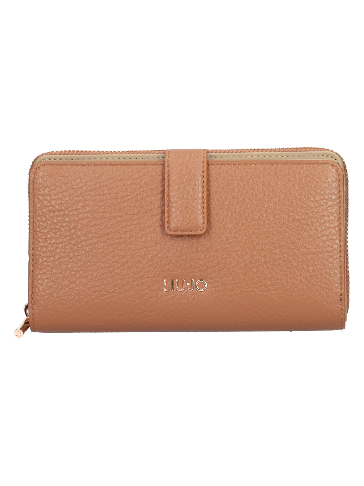 Portafoglio XL Liu Jo da donna in ecopelle martellata cuoio con rifiniture dorate scomparto con bottone con tasche per le carte e scomparto con zip con tasche per carte, banconote e monete.