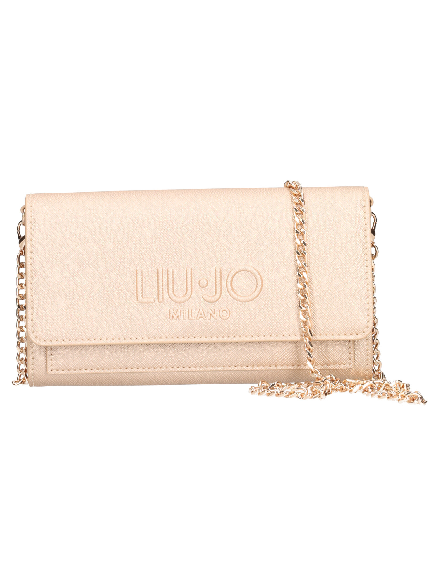 Portafoglio XL Liu Jo da donna in ecopelle oro stampa saffiano con tracolla di catena dorata, chiusura con automatico, scomparti per carte, banconote e tasca con zip per le monete.