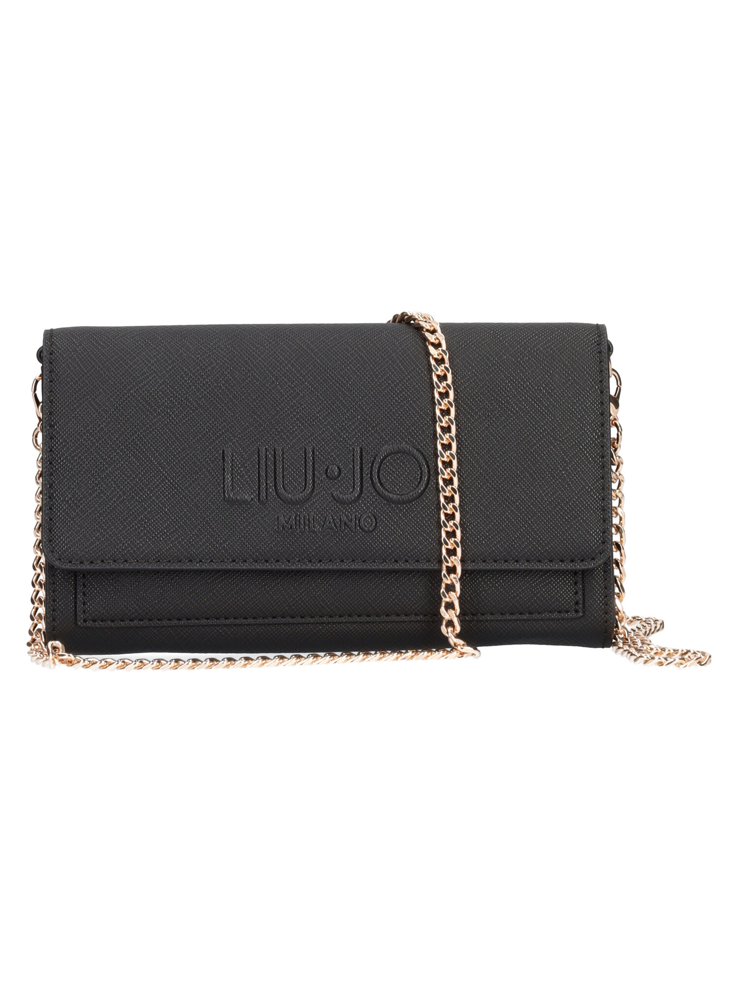 Portafoglio XL Liu Jo da donna in ecopelle nera stampa saffiano con tracolla di catena dorata, chiusura con automatico, scomparti per carte, banconote e tasca con zip per le monete.