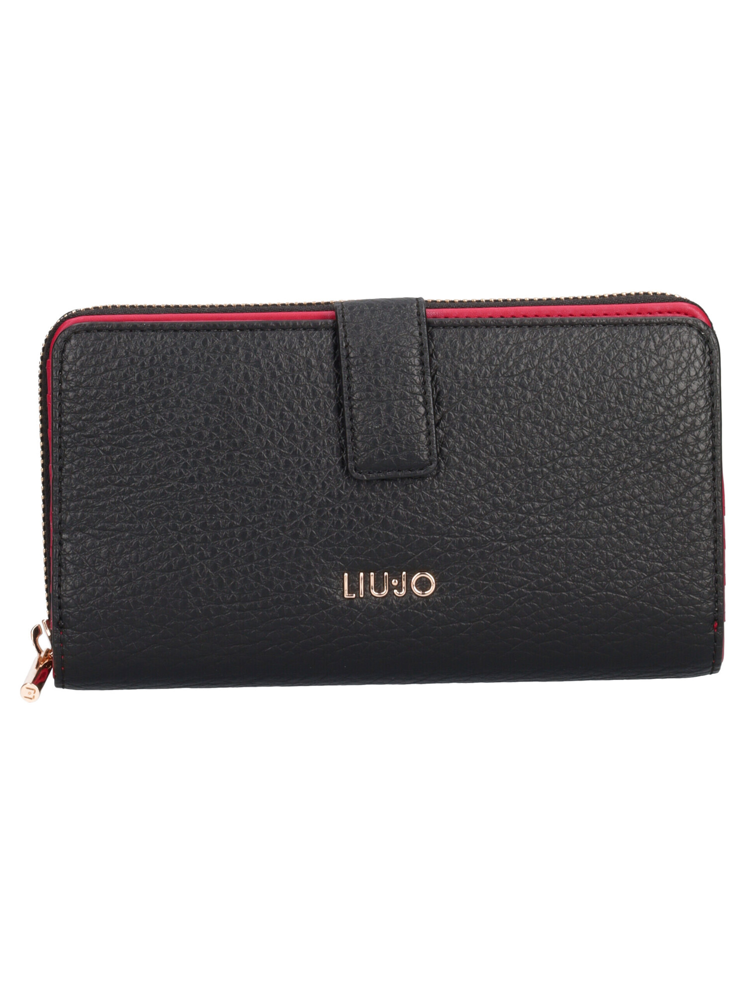 Portafoglio XL Liu Jo da donna in ecopelle martellata nera con rifiniture dorate scomparto con bottone con tasche per le carte e scomparto con zip con tasche per carte, banconote e monete.