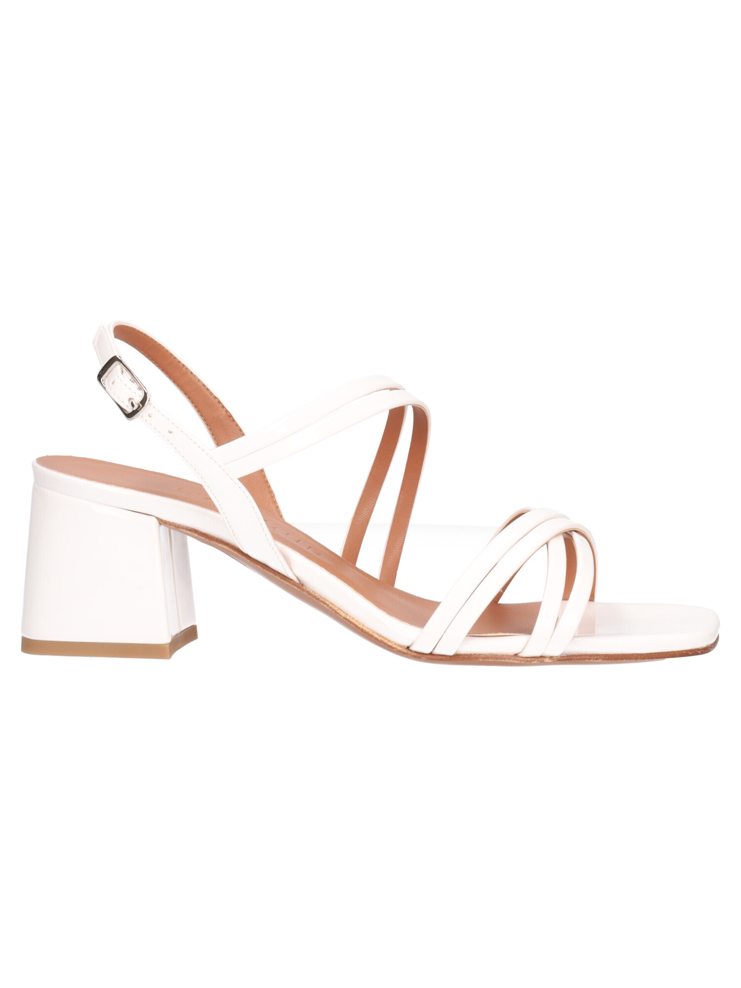 Sandalo da donna in vernice bianca con punta quadrata, sottopiede in pelle e fondo in vero cuoio tacco di 6cm.