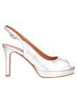 Sandalo elegante L'Amour by Albano da donna in ecopelle laminata argento con sottopiede in pelle e fondo in vero cuoio tacco di 9cm con plateau di 2cm.