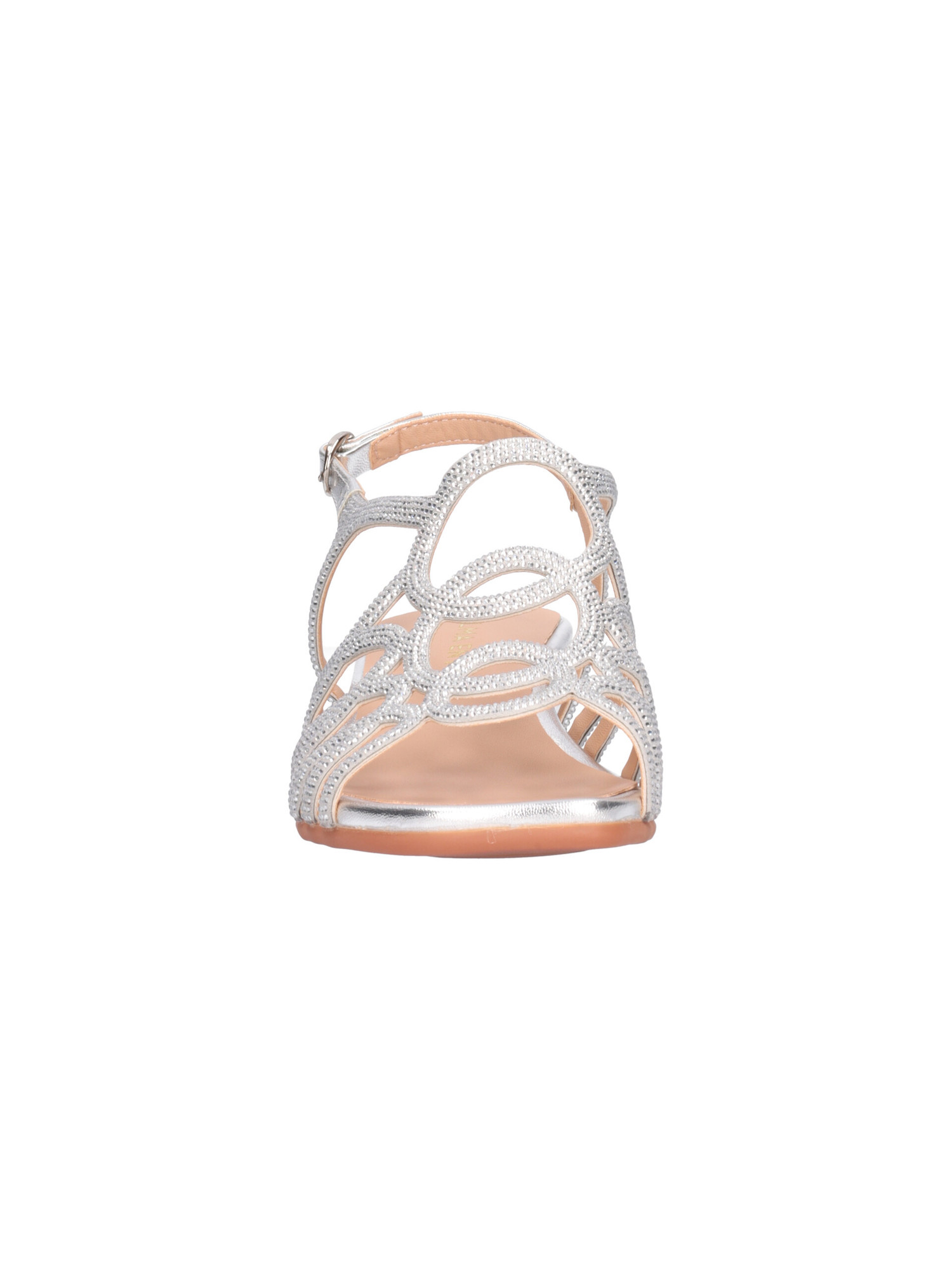Sandalo Alma en Pena da donna in ecopelle laminata argento con strass e punta quadrata sottopiede imbottito in ecopelle, fondo in gomma e zeppa di 4cm.