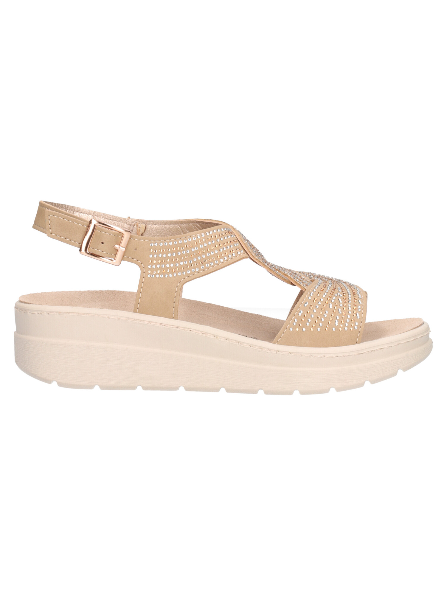 Sandalo Valleverde da donna in ecopelle beige impreziosita da strass con plantare estraibile in vera pelle fondo in gomma con zeppa di 4cm.