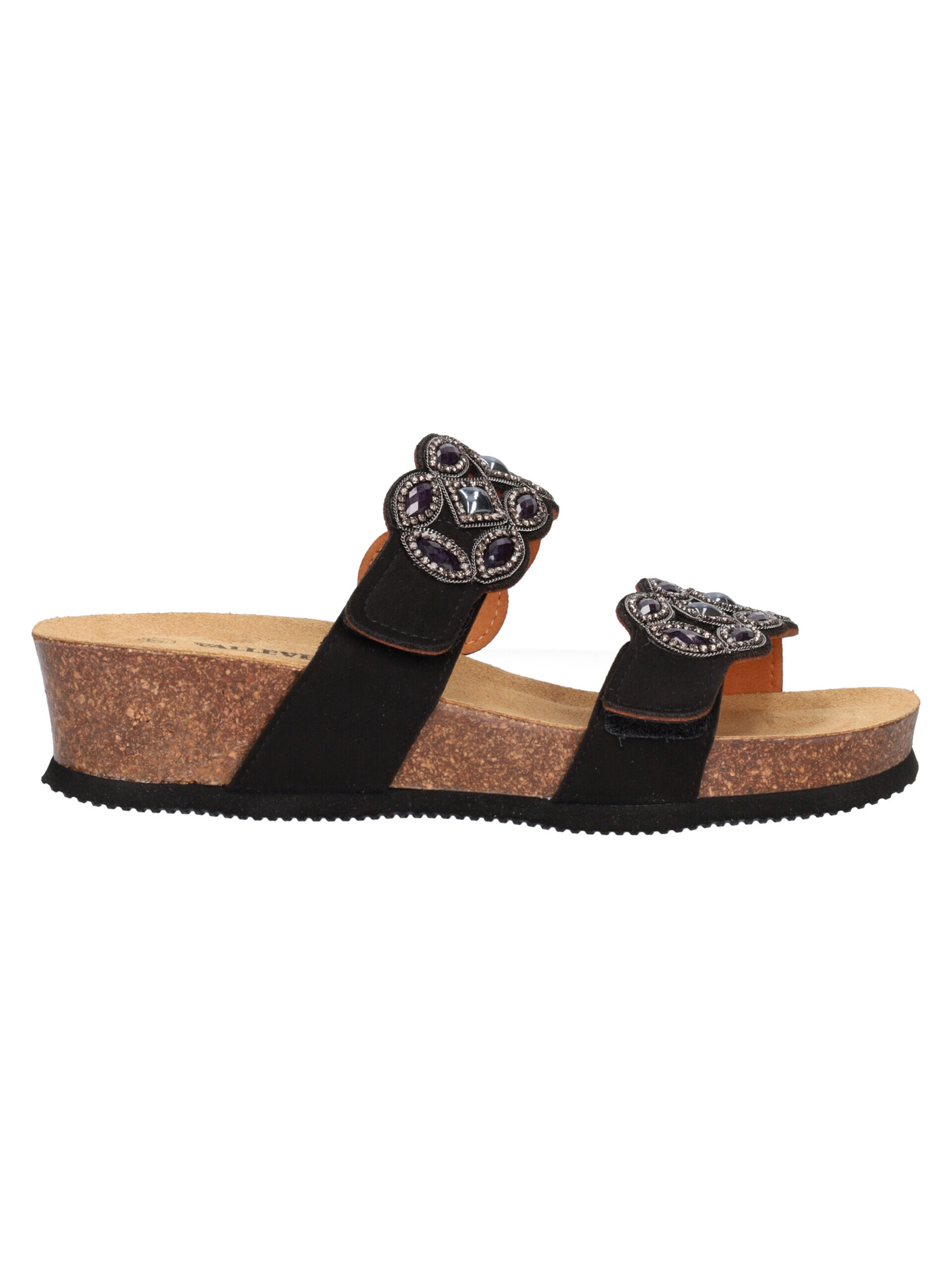 Sandalo Valleverde da donna in similcamoscio nero con strass e pietre e stretch regolabili sottopiede imbottito in vera pelle, fondo in gomma antiscivolo e zeppa di 4,5cm.