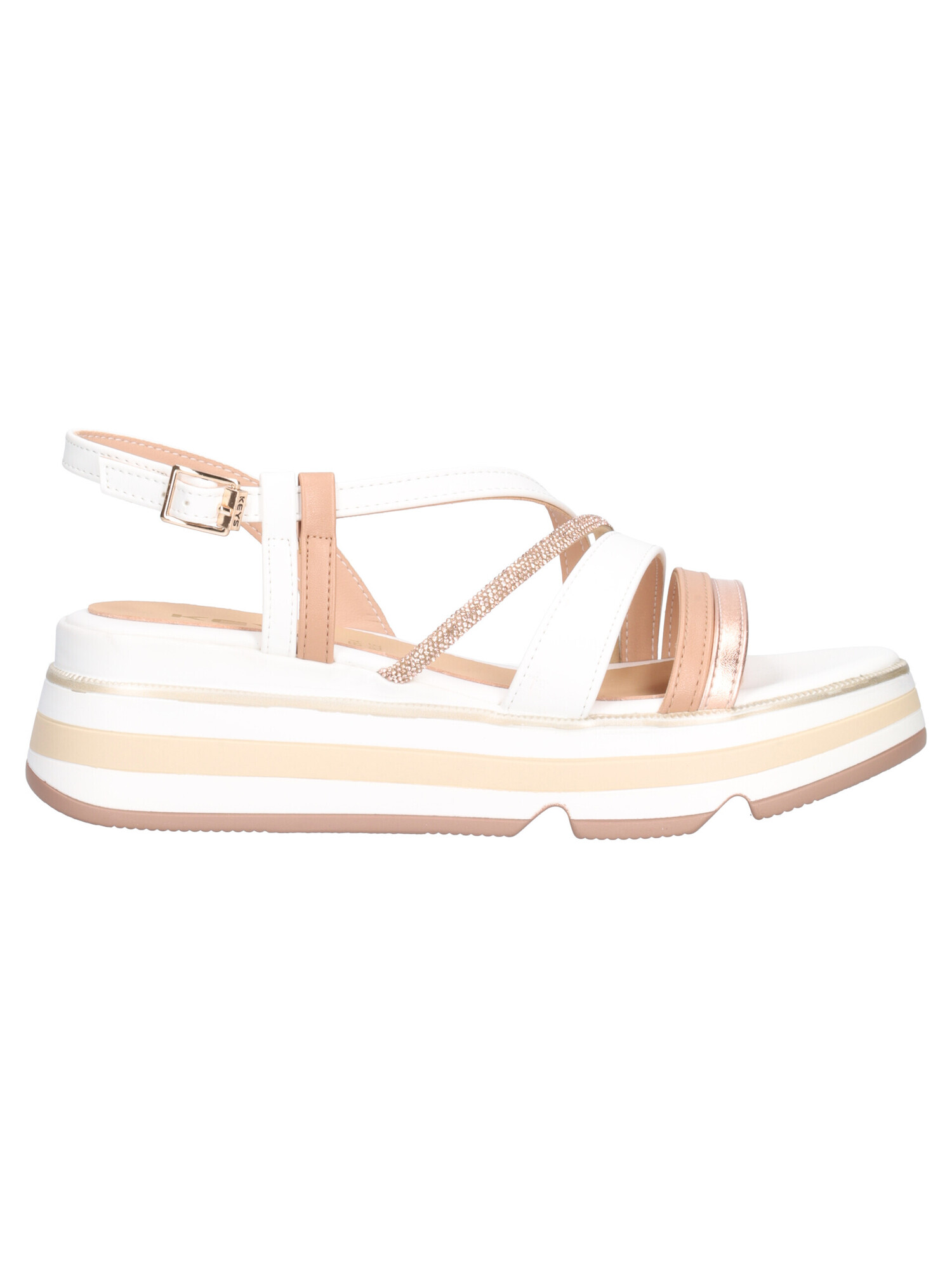 Sandalo Keys da donna in ecopelle bianca con dettagli oro rosa, sottopiede in vera pelle, fondo in gomma e zeppa di 5cm.