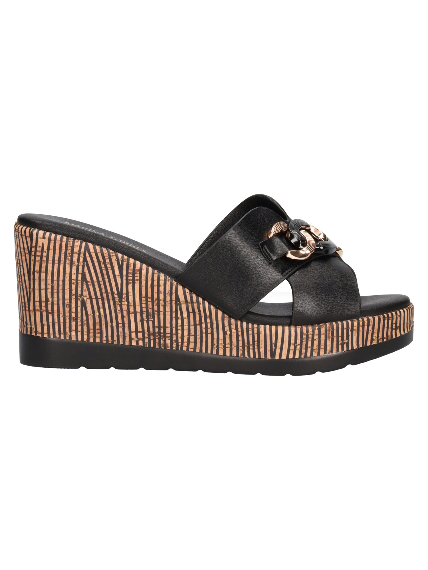 Sandalo Marina Torres da donna in ecopelle nera con dettaglio dorato, sottopiede imbottito sempre in ecopelle, fondo in gomma e zeppa di 8cm.